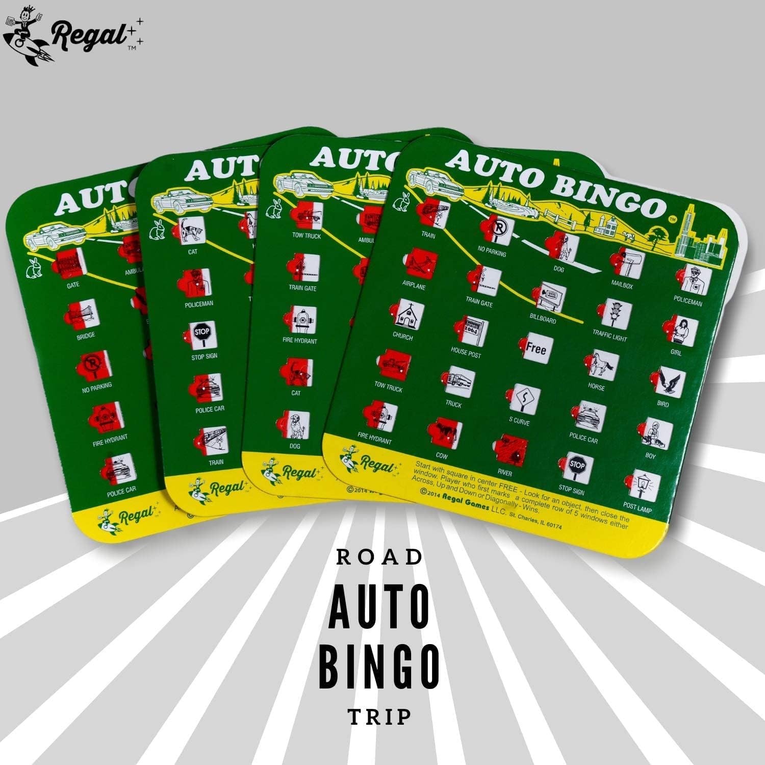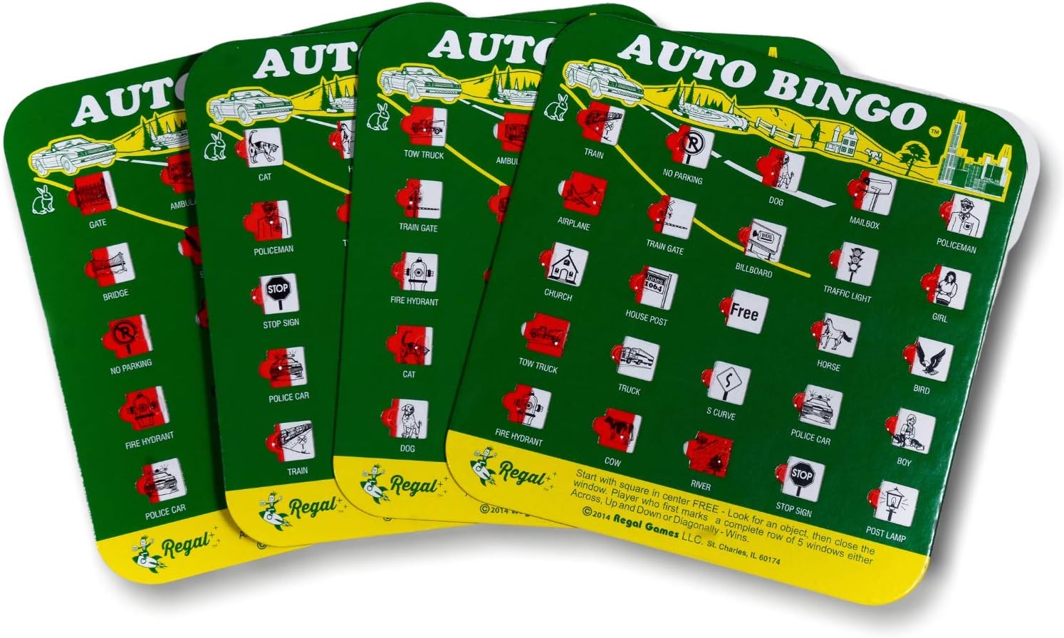- Easy-Read Bingo Cards: This set contains Auto games, featuring 4 bingo cards measuring 6-3/4 inches by 6-1/2 inches with fingertip-sliding windows. The pictures on the cards are all different.