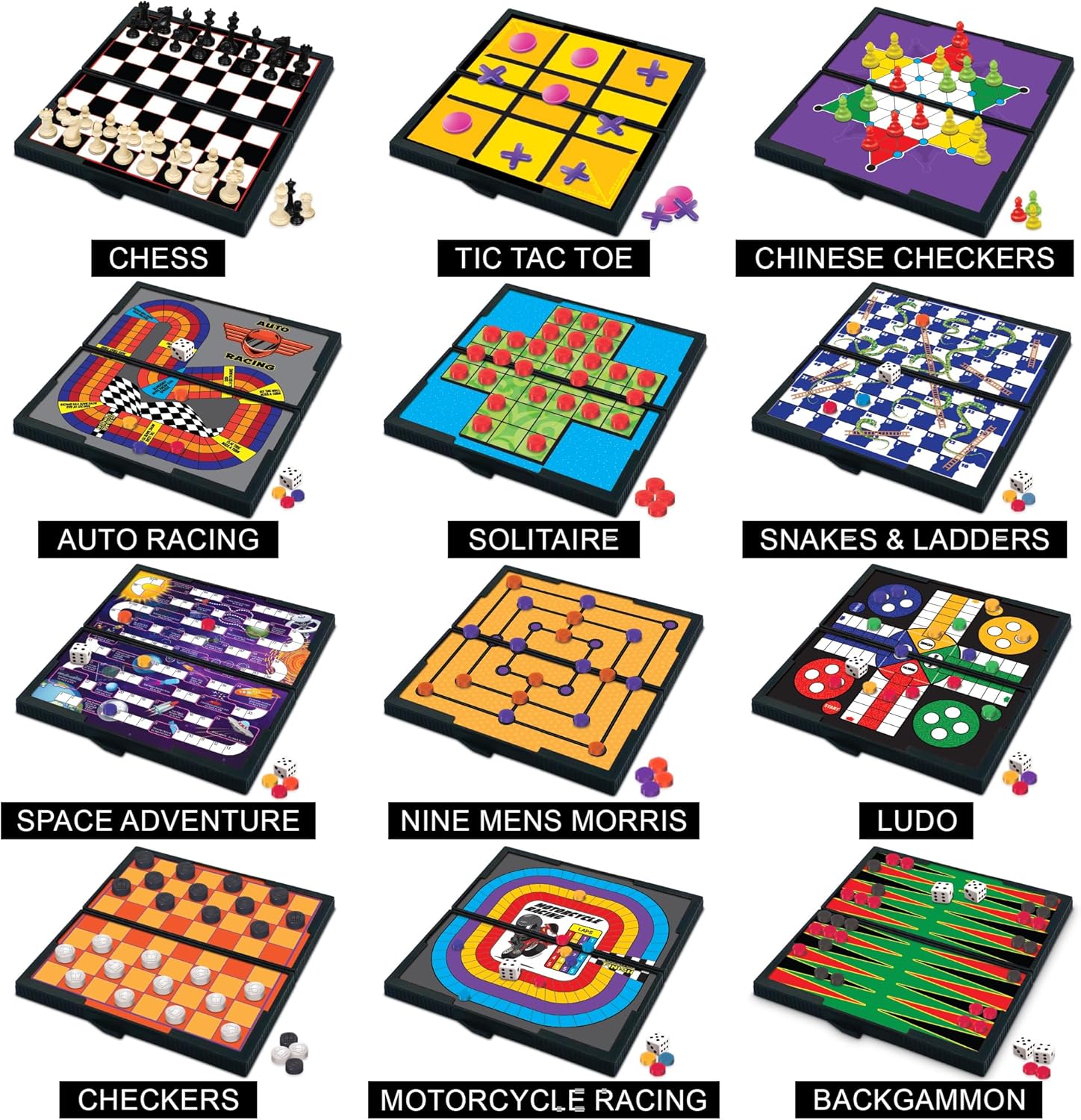 - 12 EXCITING SMALL BOARD GAMES: The Small Gamie Magnetic game set comes with a dozen fun board games that will keep the kids busily entertained for hours. They include Checkers, Chess, Chinese checkers, Tic Tac Toe, Backgammon, Snakes & Ladders, Solitaire, NineMen’s Morris, Auto Racing, Ludo, Space Venure and Racing.