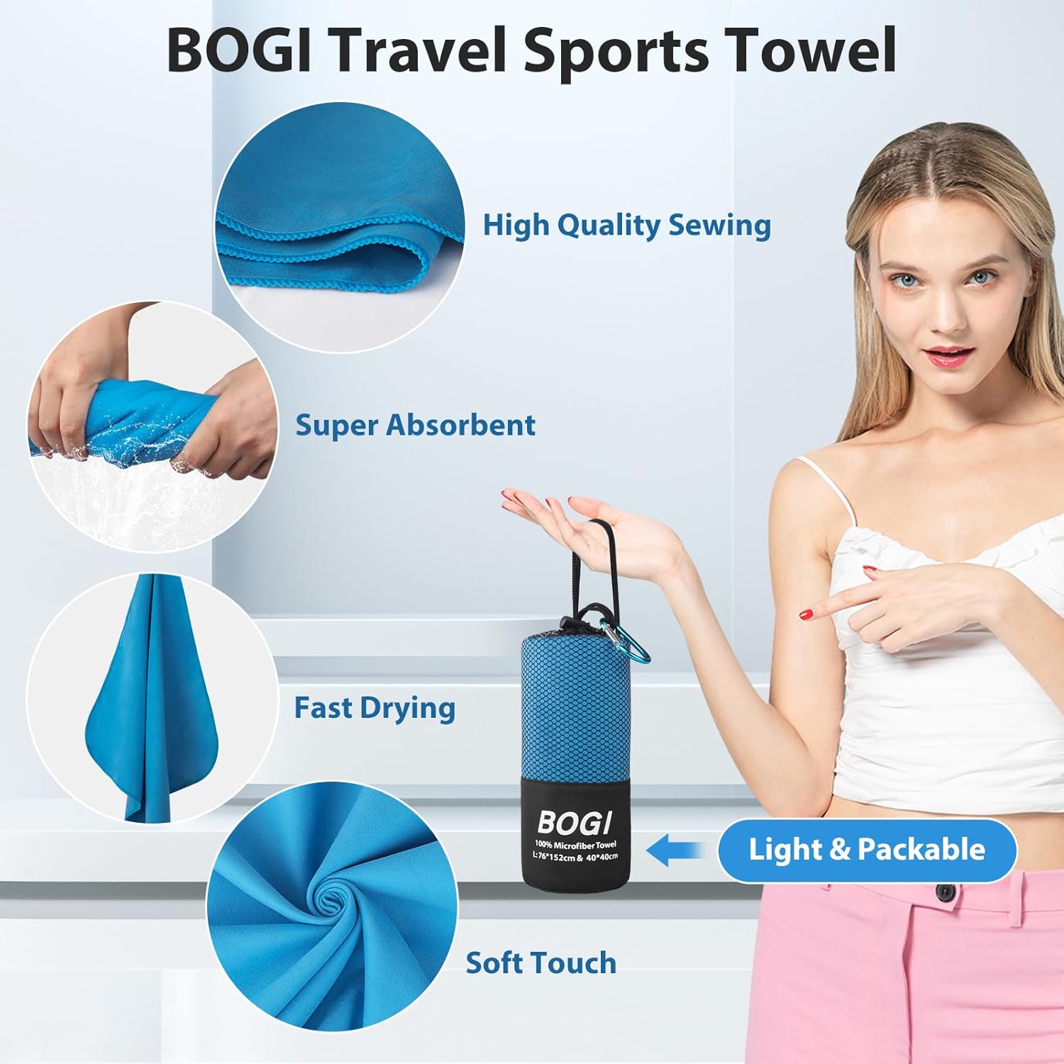 - Bonus a Gift Bag & Carabiner: BOGI towel comes with a breathable gift bag, easy to carry and hanging loop to protect your towel. When you go out or travel, you can put it into the bag. Our microfiber travel towel set is so compact and space saving. The snap loop is great for hanging up. And without worrying about it flying away. Daily lifestyle, less trouble for travel. A love gift for your family, lover and friends. If you have any questions about our towels, please feel free to contact us.