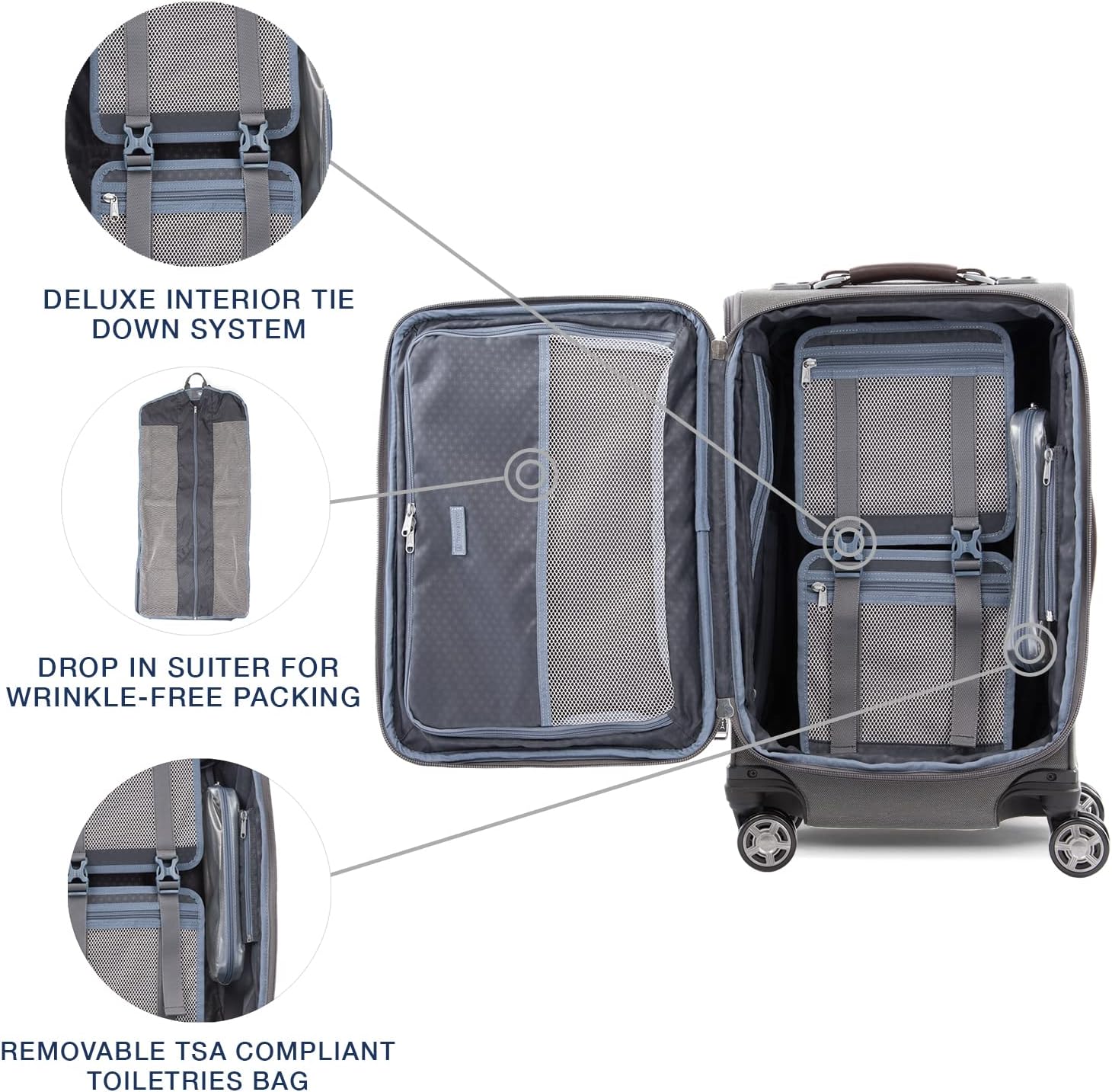 - DURABLE, ORGANIZED TRAVEL: High-density nylon with DuraGuard coating resists wear. Tapered 2" expansion adds space and stability. Interior includes drop-in suiter, tie-down straps with accessory pockets, and a removable wet pocket