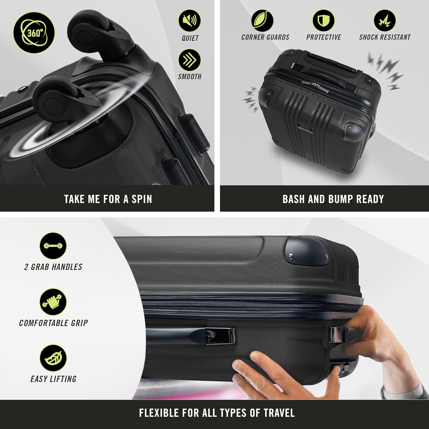 - 4-WHEEL, 360-DEGREE SPINNERS provide smooth, quiet, and effortless maneuvering.
