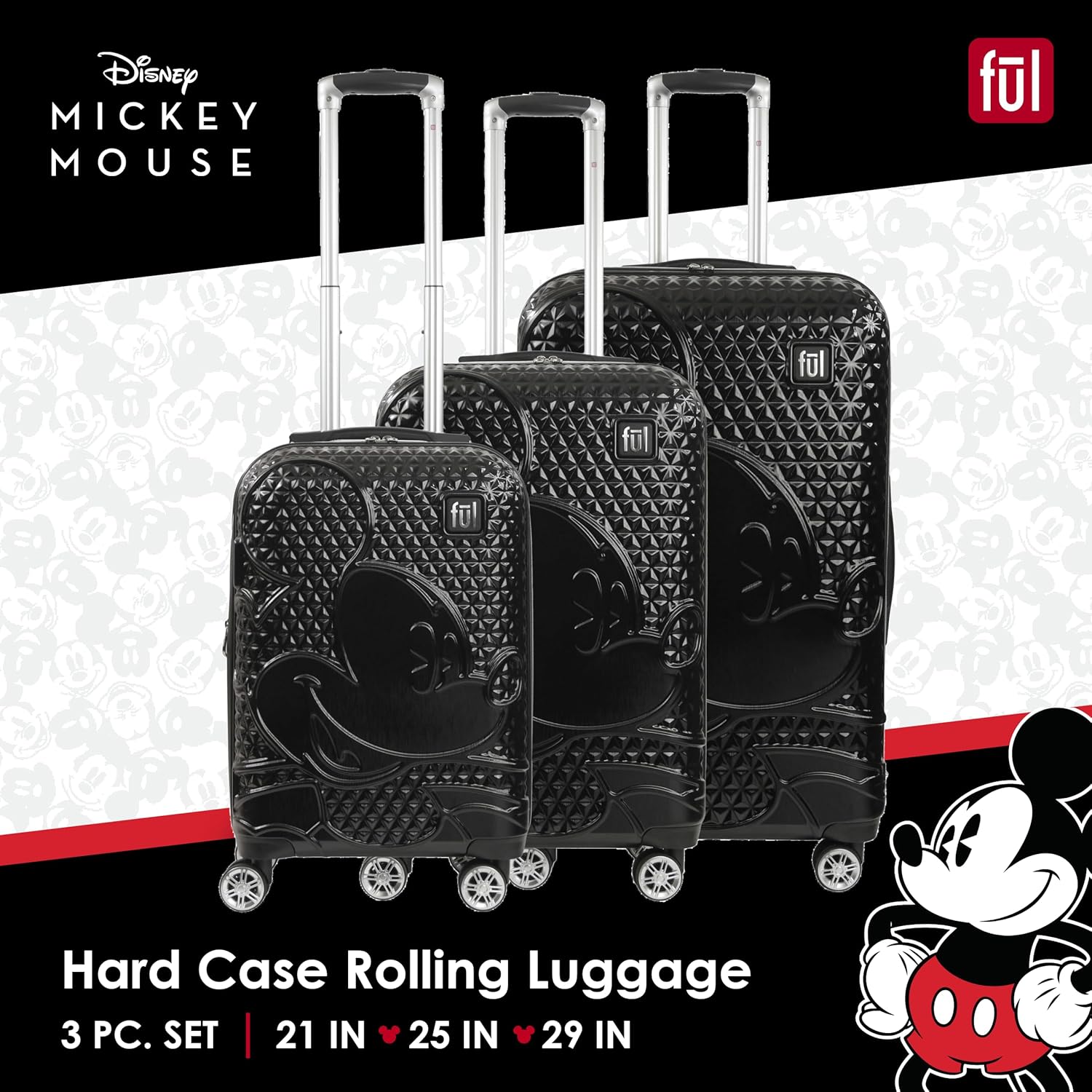 - MICKEY MOUSE TRAVEL LUGGAGE SET: Black 21, 25 and 29 inch hardshell luggage set with a cute Mickey Mouse design; small hardshell luggage carrier meets most airline requirements for carry-on luggage and fits into most overhead bins, the medium and large suitcases are intended as checked baggage for airlines