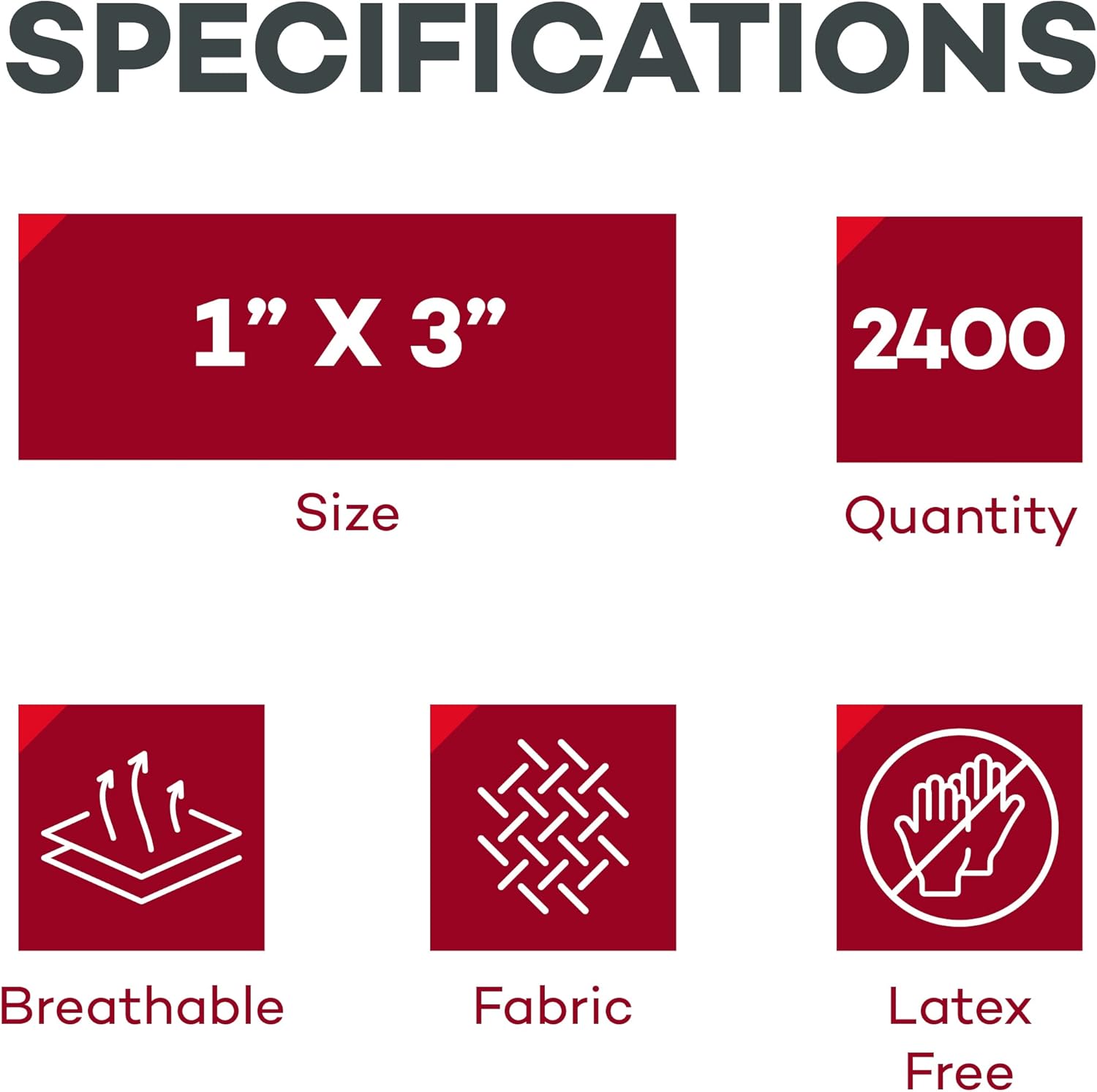 - Fabric Adhesive Bandages, 1” x 3”: Our expertly designed fabric bandages create protection that is both flexible and breathable. These incredibly strong bandages will assure that no matter what you're doing, they will move with you to provide incredible coverage and protection.