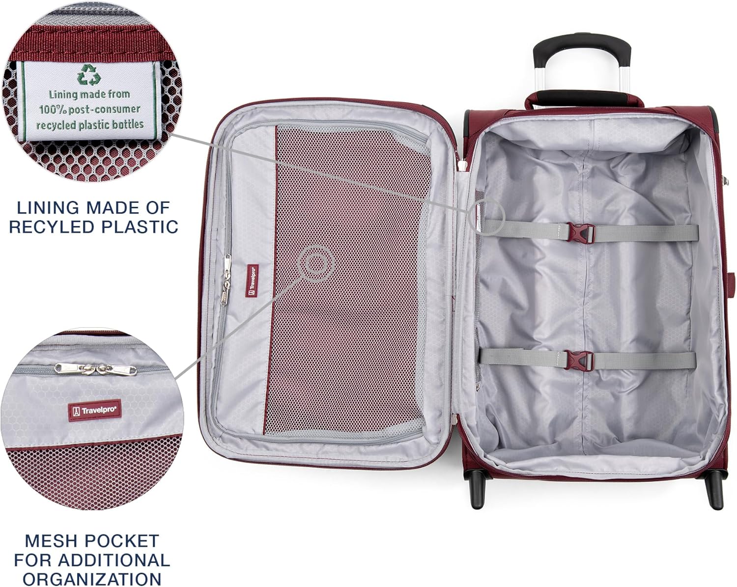 - DURABLE & ECO-FRIENDLY: Made from stain-resistant polyester with a water-repellent DuraGuard coating and ergonomic, high-strength zippers for lasting durability. The interior lining is crafted from recycled plastics for a sustainable touch.