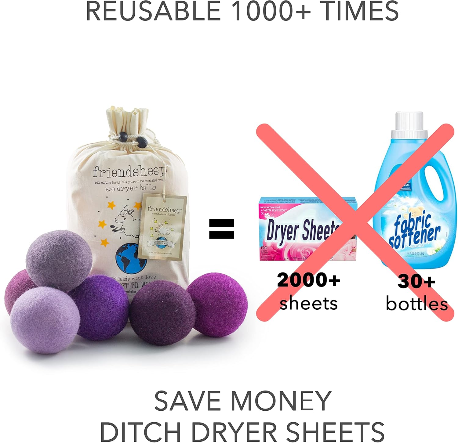 Friendsheep Wool Dryer Balls, Organic Reusable Fabric Softener Alternative for Laundry, Handmade, Fair Trade, Hypoallergenic, Eco-Friendly, Plastic-Free (6 Pack XL - Purple Haze)