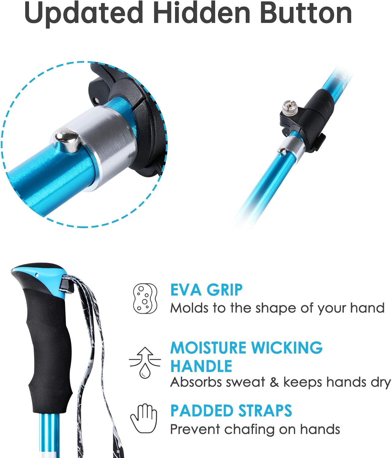 - FOLDABLE AND DOUBLE LOCKING:YOVITAL Walking Sticks Collapsible Hiking have an easy to folding system. You can extend your trekking poles from 43" all the way to 53" quickly. Note: Please be careful not to exceed STOP line. When not in use, trekking poles can be folded to 11" to be stored within your backpack. Trekking poles have a hand tightener and a hidden button for double locking.