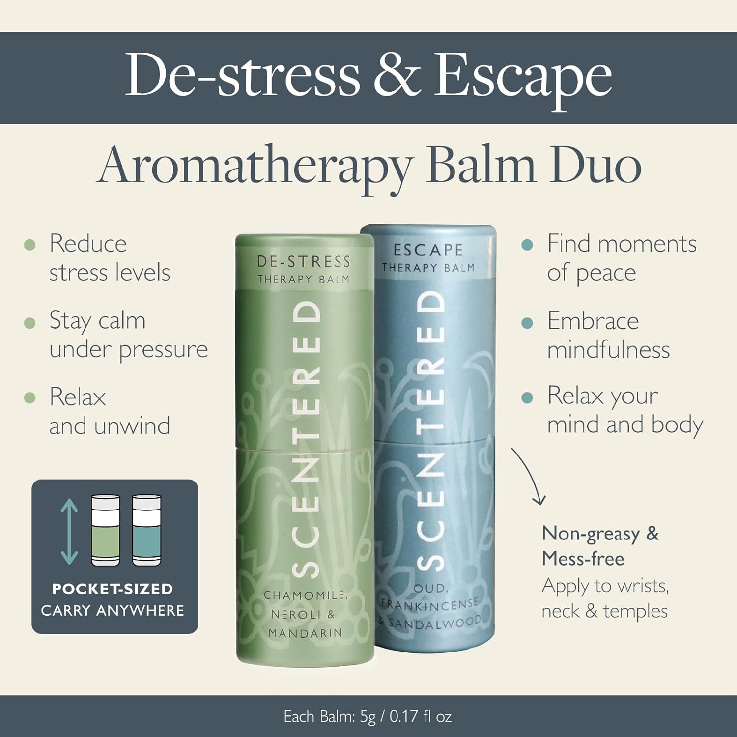 - Aromatherapy Balms for Stress-Relief & Calm – The De-Stress Balm promotes relaxation and natural calm with a soothing chamomile essential oil blend, while the Escape Balm clears the mind and encourages peace and calm with relaxing frankincense essential oil. Perfect for stress relief and mindfulness meditation on the go. 5g / 0.17 oz each.