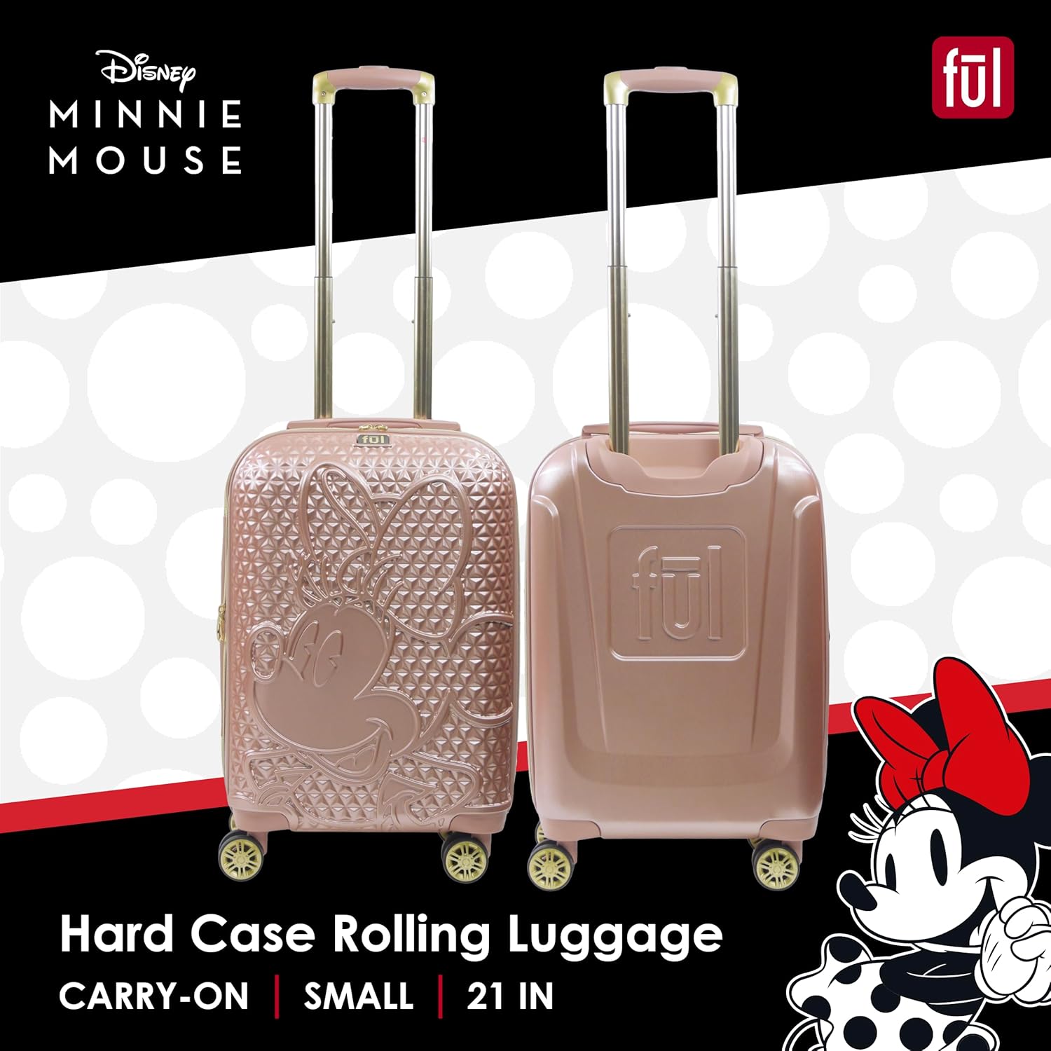 - MINNIE MOUSE TRAVEL LUGGAGE: Rose gold textured hardshell luggage with a cute Minnie Mouse design; Hardshell luggage carrier meets most airline requirements for carry-on luggage and fits into most overhead bins