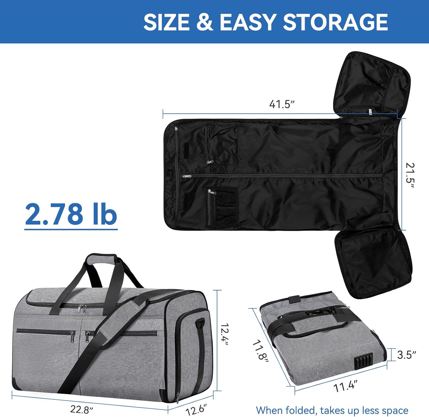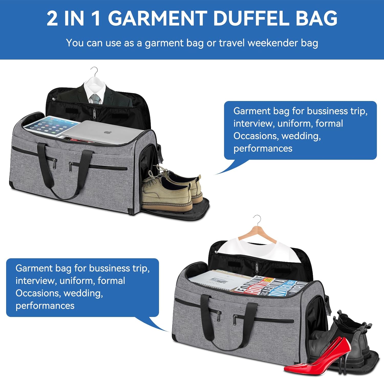 - 【2 in 1 Garment Bag】: NEAT & WRINKLE FREE. This garment travel bag combines the feature of a garment bag and a travel duffle bag. With extended space and 4 elastic straps to keep your suits and dress neat and wrinkle-free for a business trip, it can turn out to be a travel duffle bag for vacation. Ideal for the people who often go for a business trip, formal party, vacation, weekend away, gym, or touring performances.