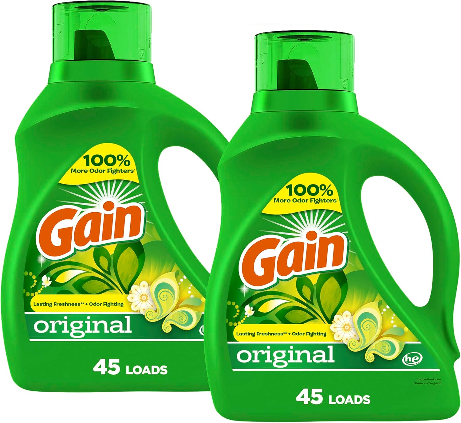 - WHAT’S INCLUDED: Includes two 65 fl oz bottles of Gain Laundry Detergent Liquid with Odor Fighters in Original scent, good for 90 Loads (2 bottles of 45 Loads each)
