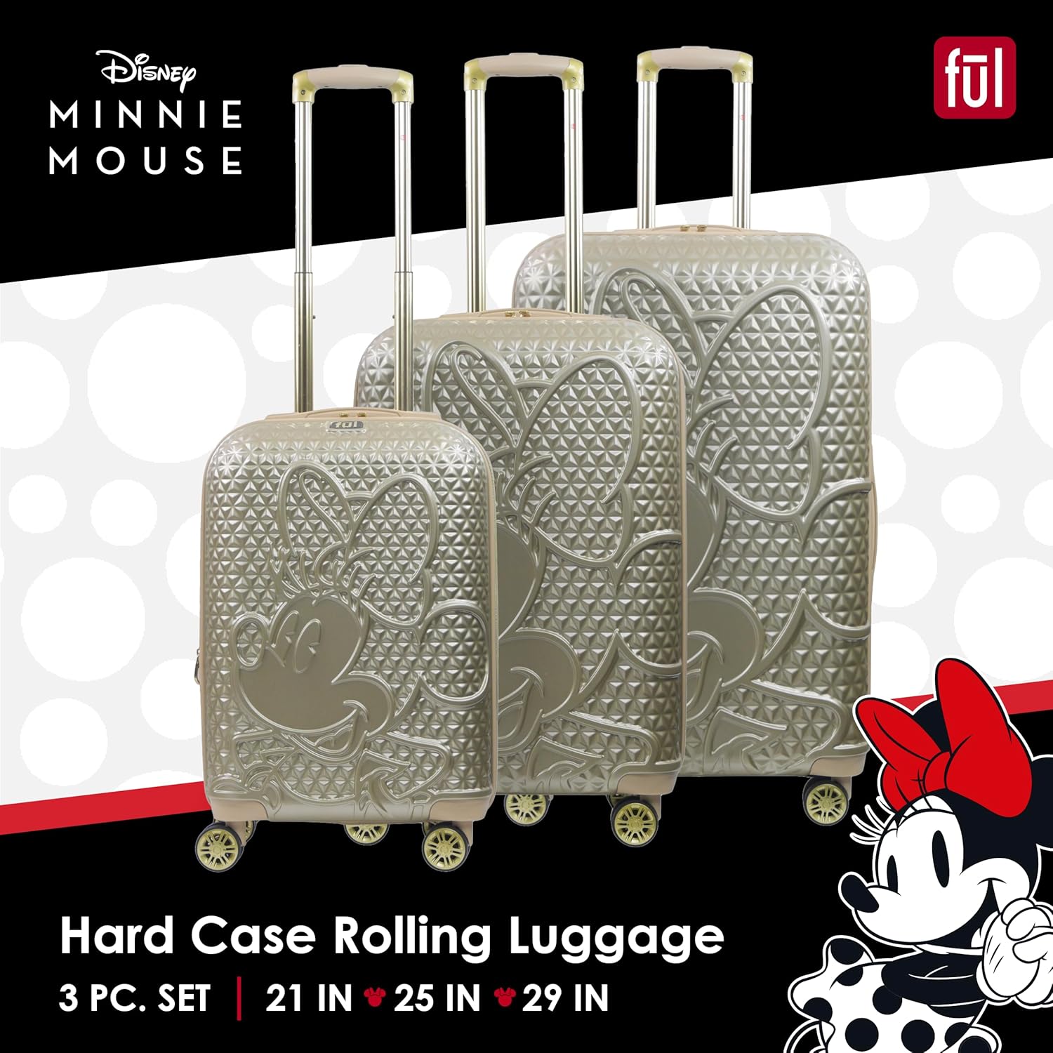 - MINNIE MOUSE TRAVEL LUGGAGE SET: Taupe textured 21, 25 and 29 inch hardshell luggage set with a cute Minnie Mouse design; small hardshell luggage carrier meets most airline requirements for carry-on luggage and fits into most overhead bins, the medium and large suitcases are intended as checked baggage for airlines