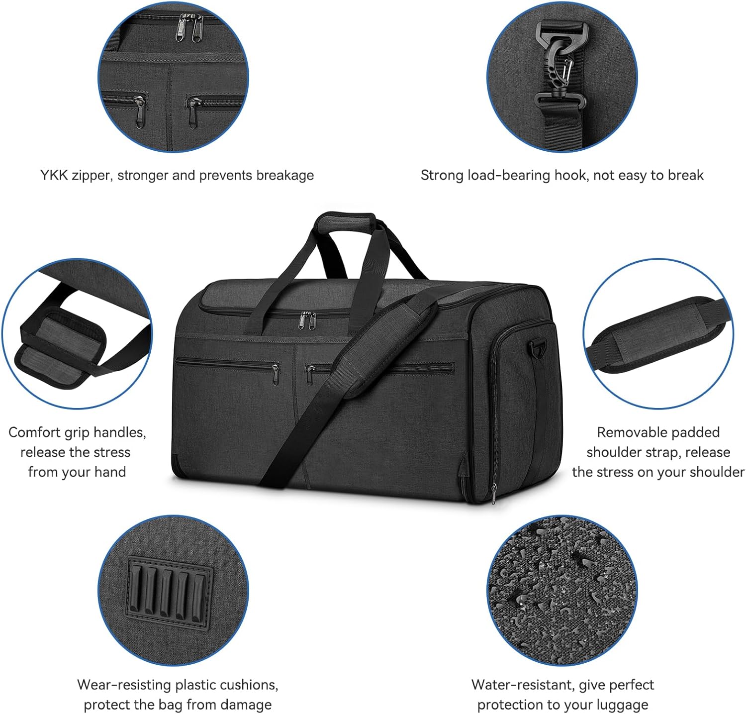 - Easy to Carry: Short loop handles allow you to easily carry the garment travel bag through the airport or pull out the detachable and adjustable shoulder strap for travel, with the convenient bag strap that allows you to slide your duffel directly over the strap of your suitcase. (Note: the shoulder strap is packaged in the side pocket.)
