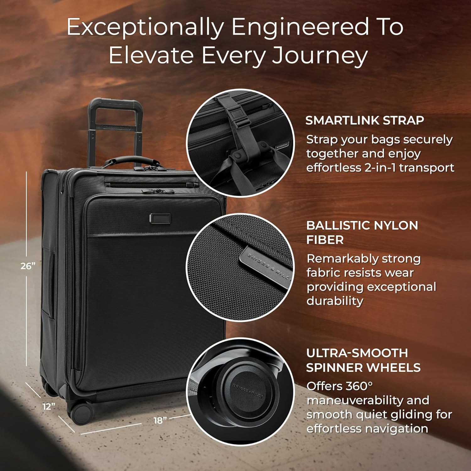 Briggs & Riley 26" Medium Expandable Spinner - Checked Luggage for Travel, Suitcases with Wheels, Softside Rolling Bag for Men & Women, Self-Repairing Zipper - Baseline Collection, Black