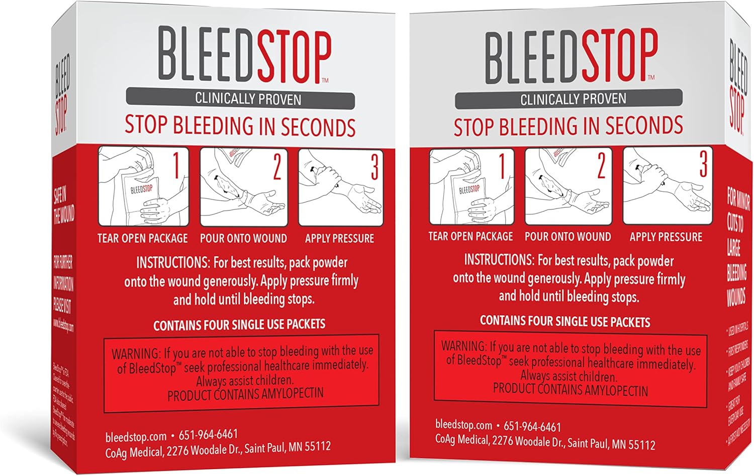 BleedStop™ First Aid Powder for Blood Clotting, Trauma Kit, Blood Thinner Patients, Camping Safety, and Survival Equipment for Moderate to Severe Bleeding Wounds or Nosebleeds (Double 4 Pack 15g)