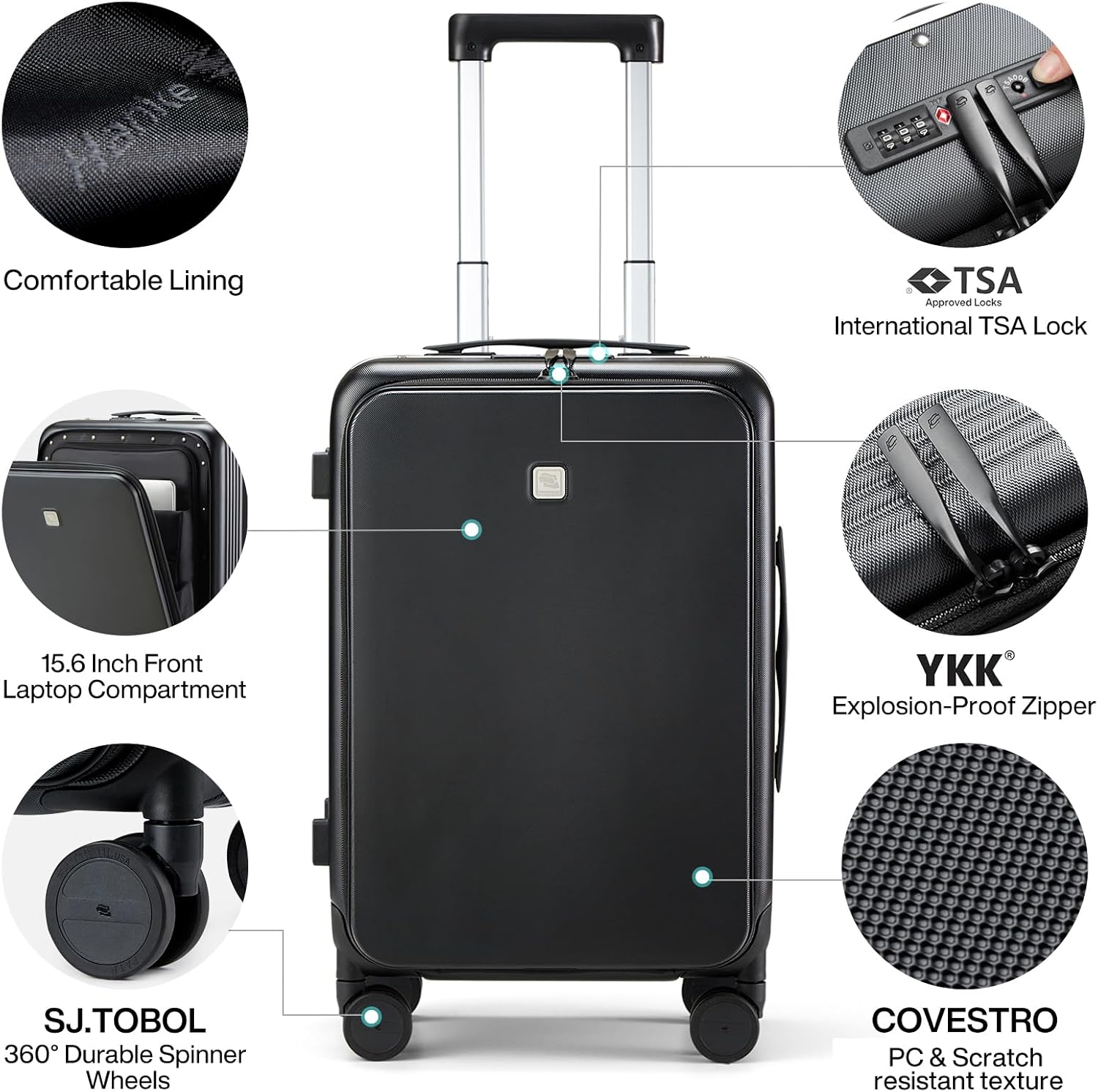 Hanke Grace Hard Shell Suitcases with Wheels,20 Inch Carry On Luggage Airline Approved with Aluminum Frame, Travel suitcase with Front Pocket Travel Luggage for Short Business Trips, Jet Black.
