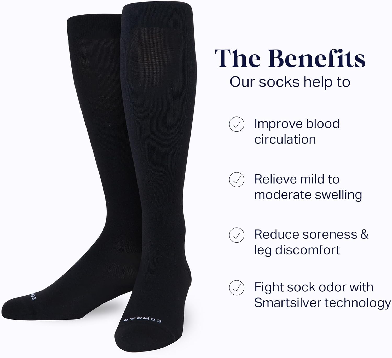 - All-Day Support: With 15-20 mmHg of True Graduated Compression, Comrad Nylon Knee-High Compression Socks offer all-day comfort. These compression socks for men and women promote circulation and help prevent sock odor with SmartSilver technology. Pack of 3 in Black. 91% Nylon / 9% Spandex.