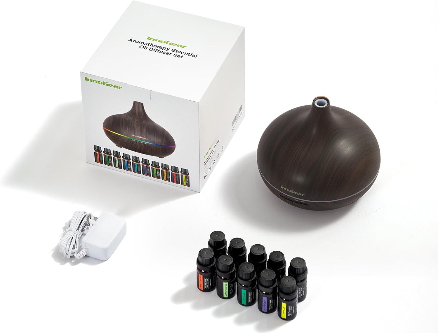 InnoGear Aromatherapy Diffuser & 10 Essential Oils Set, 400ml Diffuser Ultrasonic Diffuser Cool Mist Humidifier with 4 Timers 7 Colors Light Waterless Auto Off for Large Room Office, Dark Wood Grain