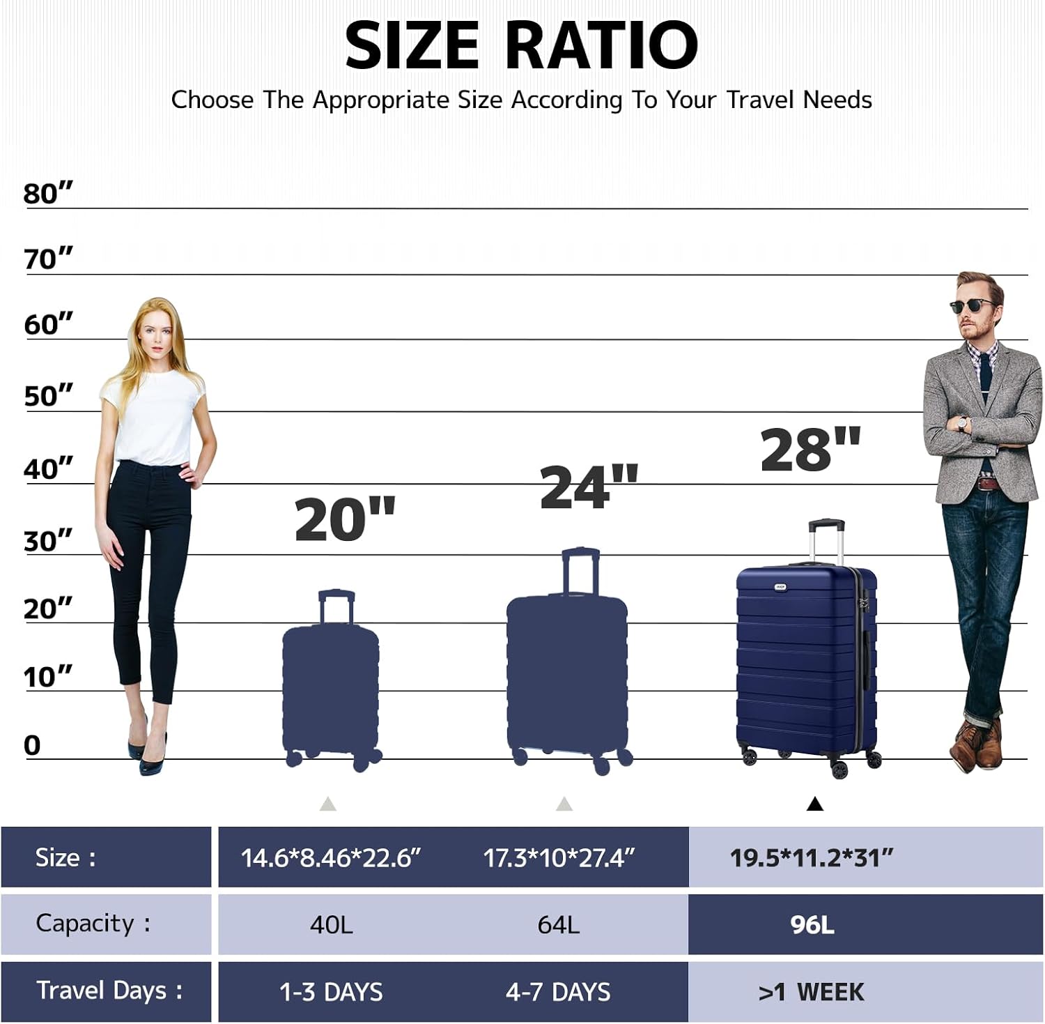 - [Checked-Large 28 Inch] The 28-inch suitcase meets the functions of boarding, travel, and daily storage. Size: 19.5*11.2*31 inches. Capacity: 96L.