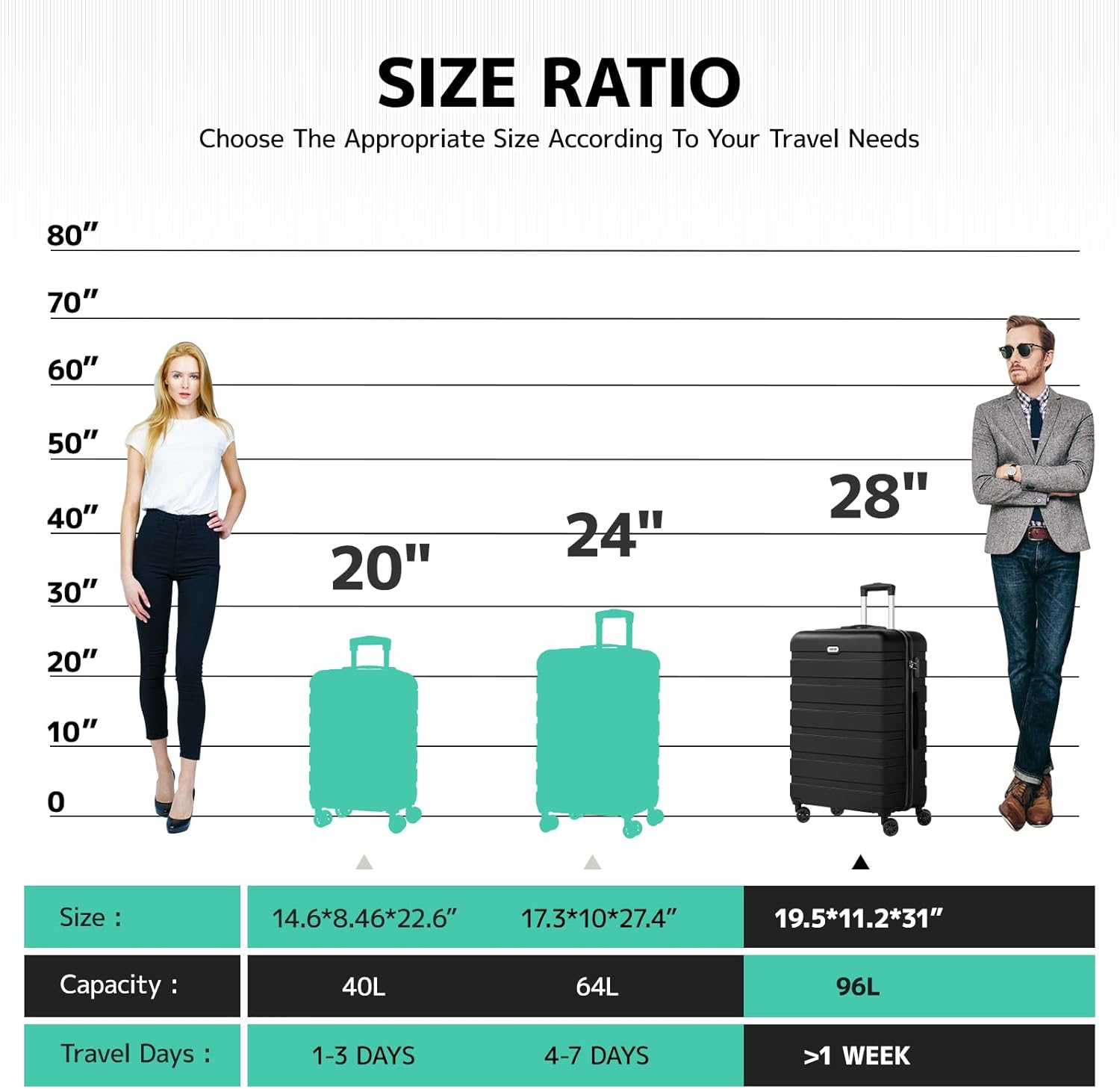 - [Checked-Large 28 Inch] The 28-inch suitcase meets the functions of boarding, travel, and daily storage. Size: 19.5*11.2*31 inches. Capacity: 96L.