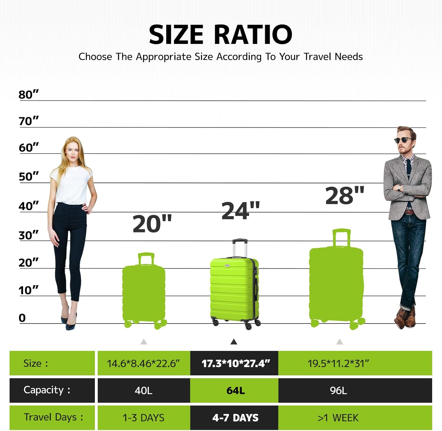 - [Checked-Medium 24 Inch] The 24-inch suitcase meets the functions of boarding, travel, and daily storage. Size: 17.3*10*27.4 inches. Capacity: 64L.