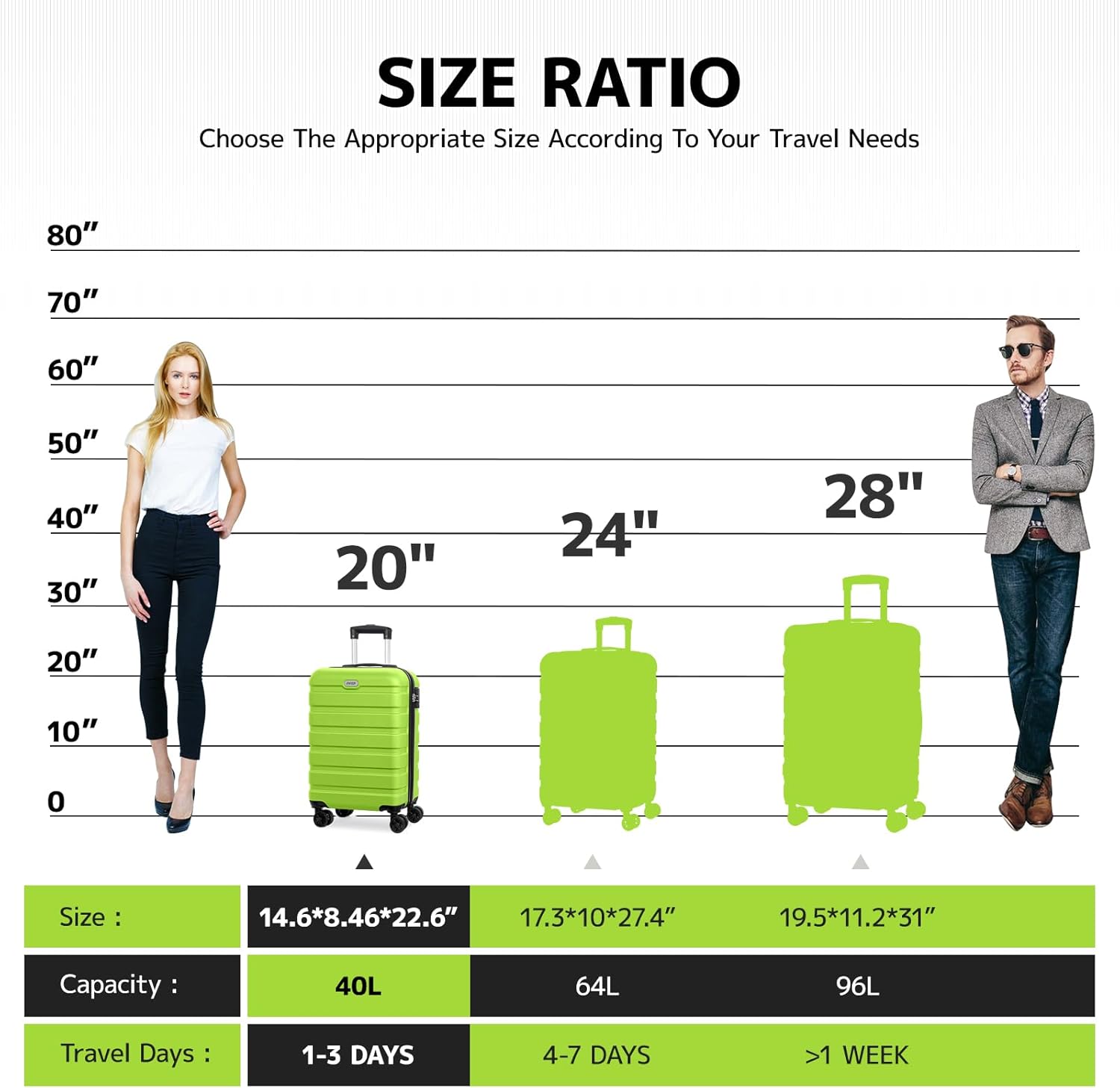 - [Carry-On 20 Inch] The 20-inch suitcase can meet the functions of boarding, travel, and daily storage, and can be brought on the plane without checking in. Size: 14.6*8.46*22.6 inches. Capacity: 40L.