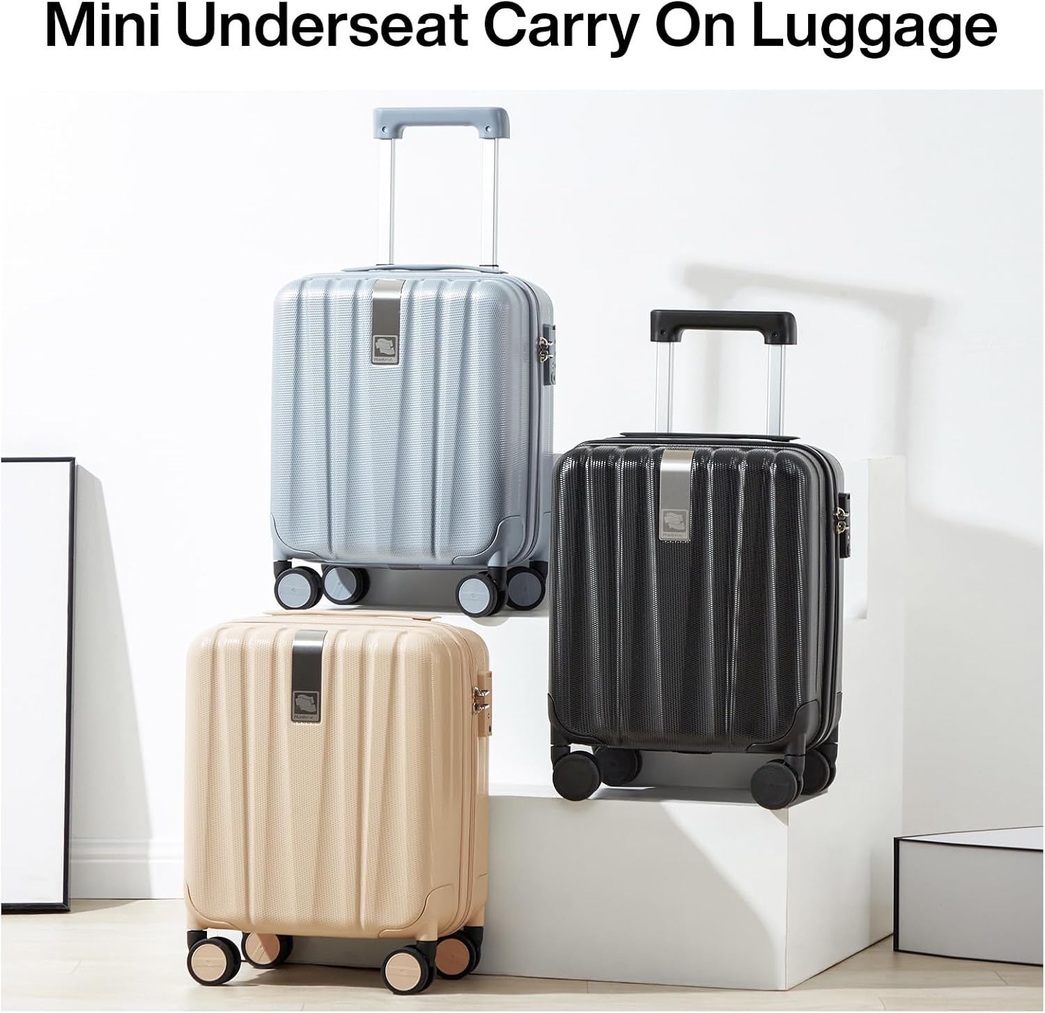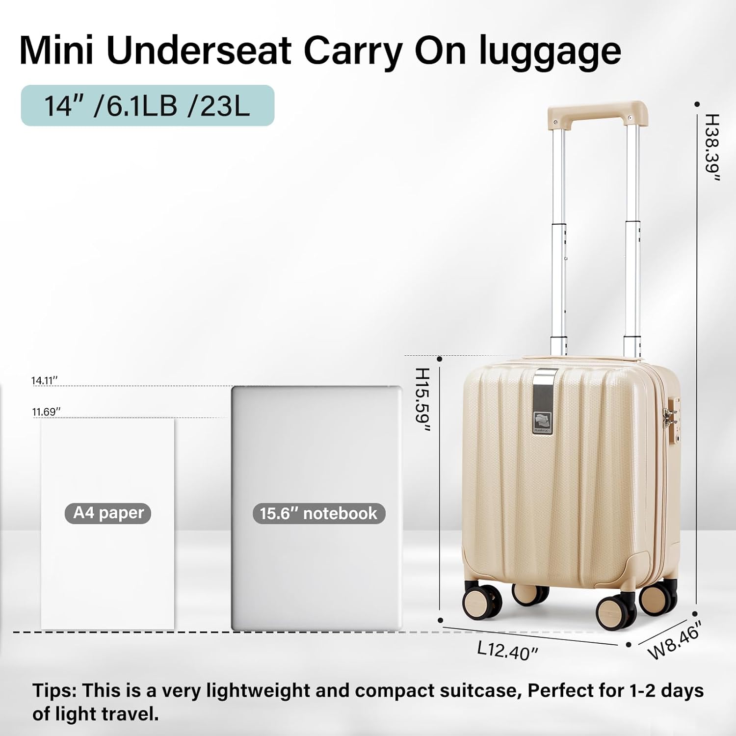 - 【FITS UNDERSEAT】This suitcase fits under most airline seats for easy access to belongings en route. Including wheels and handles(can ont expandable),Underseat 14-Inch:L12.4 x W8.46 x H15.59", 23L, 6.1LB, mini underseat carry on luggage airline approved & can fit in the overhead bin.This suitcase can also be a great wedding gift and vacations,birthday gifts and christmas gifts.