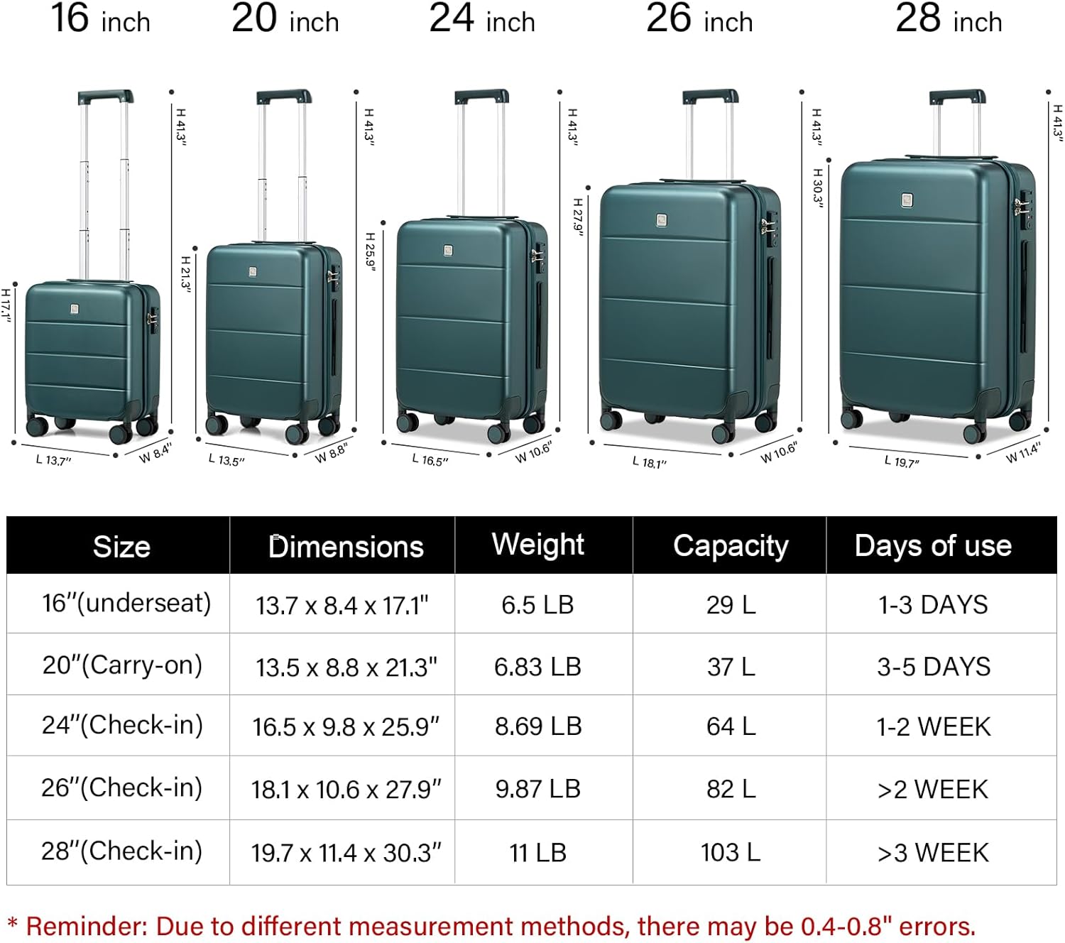 - 【Product Dimensions】 24 inch luggage(including wheels and handles) L16.5 x W9.8 x H25.9 IN, 64L, 8.69LB, international checked luggage with spinner wheels & hard shell suitcases for work travel, weekend trip.
