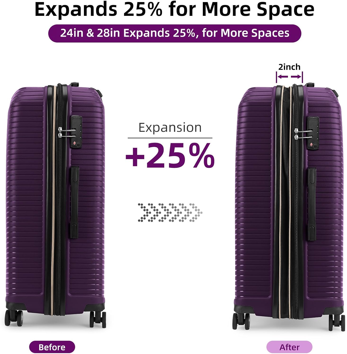 - 5 Piece Luggage Sets: 28inch, 24inch (ONLY 28inch and 24inch are expandable, adding 25% space capacity for hardshell luggage),18inch, 20inch and 24inch luggage is perfect for business and personal travel, 14inch suitcase can store can store toothbrush,wallet,makeups,etc