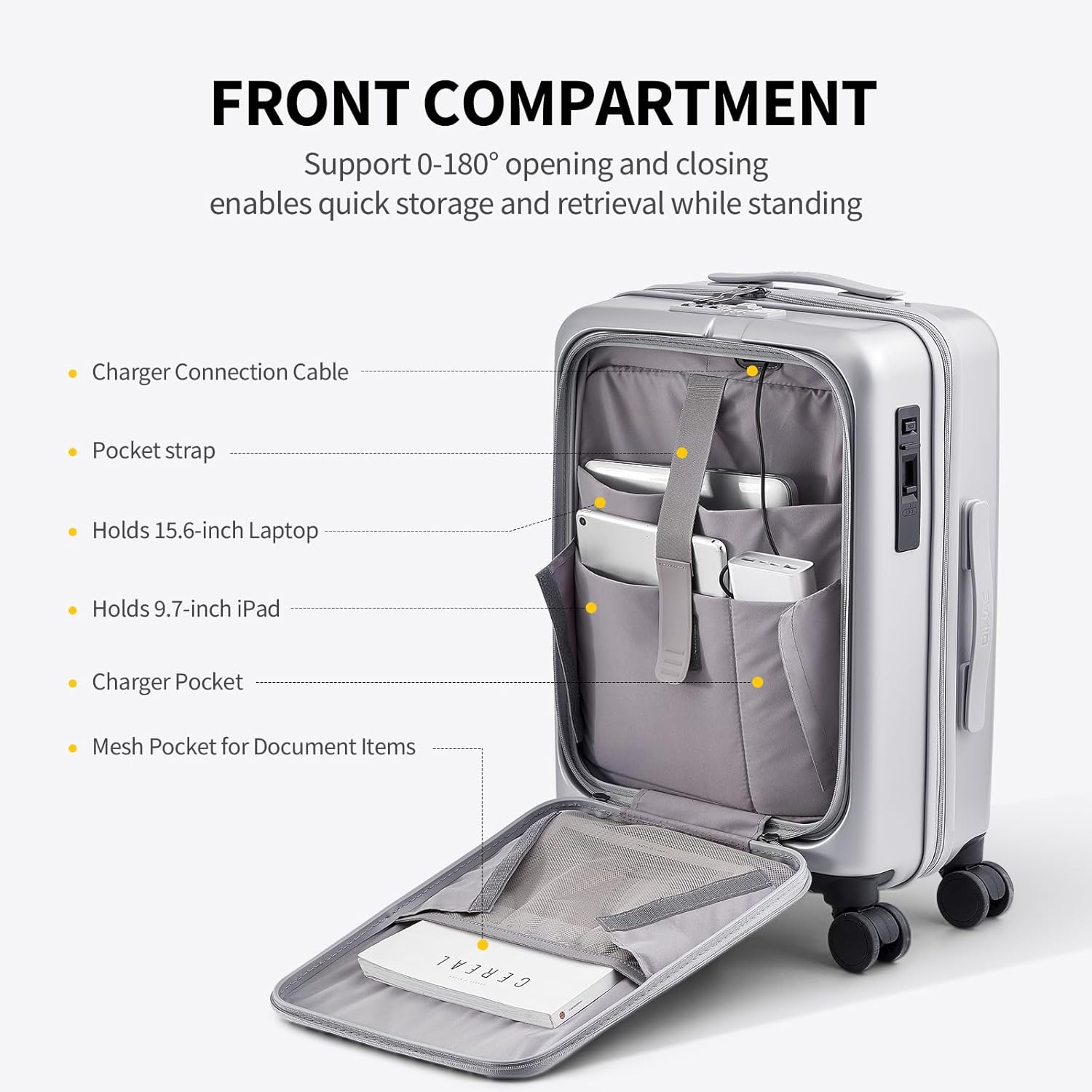 - CARRYON WITH LAPTOP COMPARTMENT: Our innovative carry on luggage comes with a front opening design that allows you to quickly access your laptop and essentials. The built-in USB port allows you to maintain charging without carrying a bulky power bank. These clever features ensure that you free up your hands while traveling, allowing you to experience a relaxed and comfortable journey
