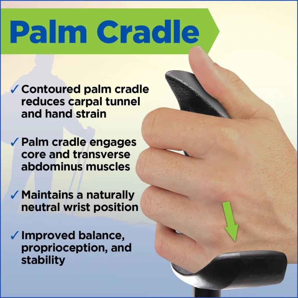 - HIGH QUALITY WALKING POLES: 2 pack of adjustable walking / hiking / rehab poles with a patented contoured grip and dual support zones, designed to provide better balance and stability. Perfect for pole walking for seniors, our patented grips provide a 10 times reduction in stress at thumb carpometacarpal (CMC) joint by positioning thumb on top in a pinching position rather than grasping with thumb around the side.