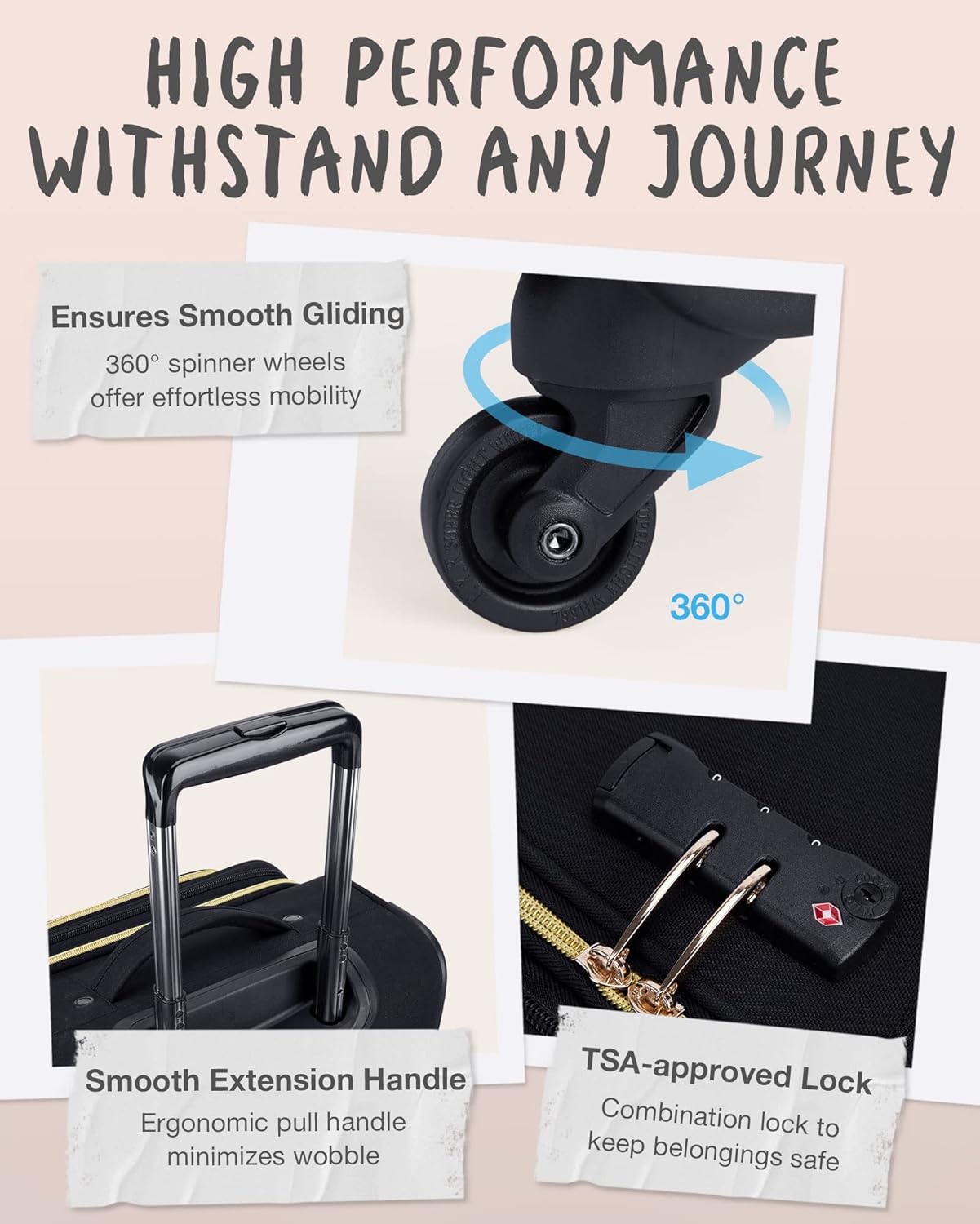 - High Performance- The 2-step ergonomic high-grade aluminum tube handle, can adjust to multiple heights while minimizing wobble, which offers easy mobility.360° Spinner Wheels- Rolling suitcase with wheels offer a sturdier base for effortless gliding, even when full.