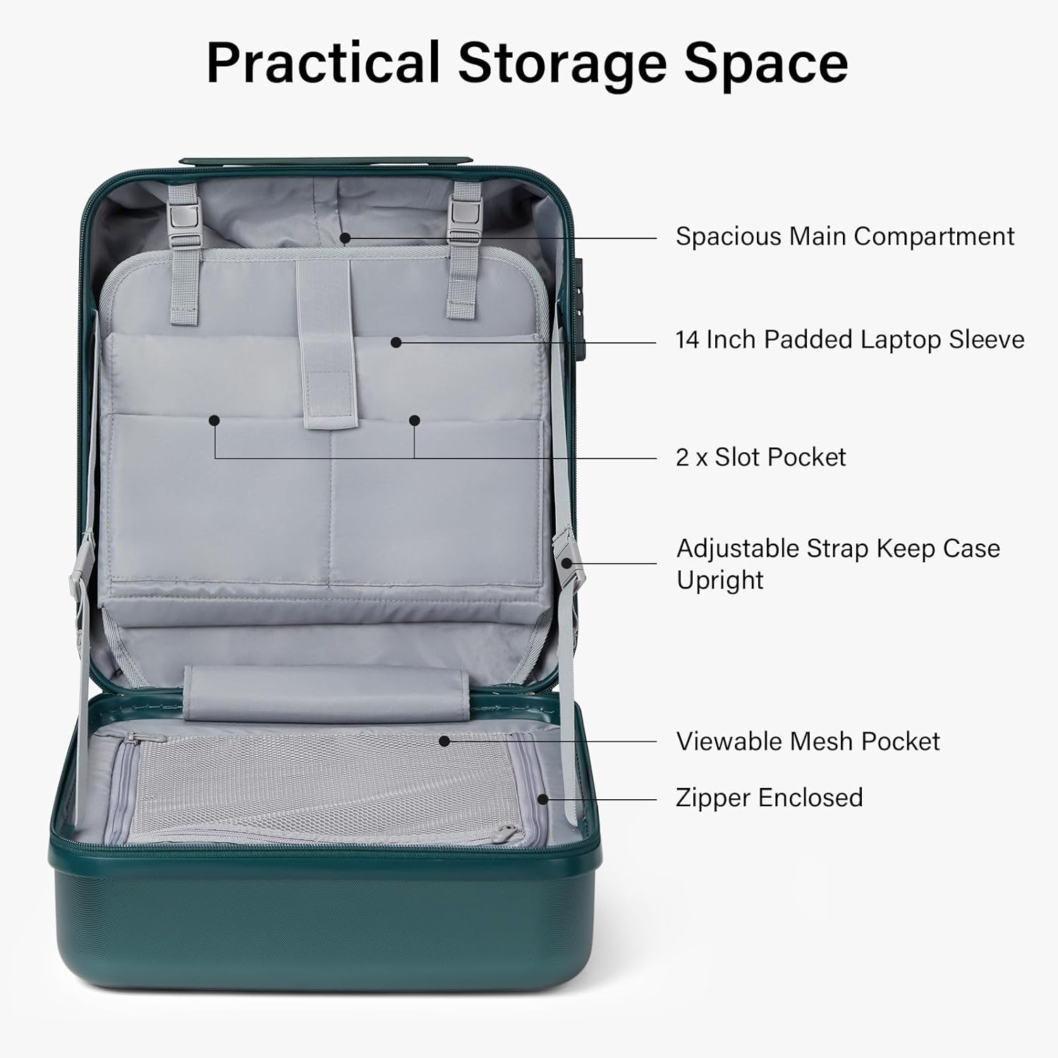- 【Multiple Compartment】This luggage carry on with spacious main compartments and enclosed zipper compartment for clothes, then a mesh pocket on it. Features a padded laptop compartment that fits laptop up to 14 inches and 2 slot pockets.