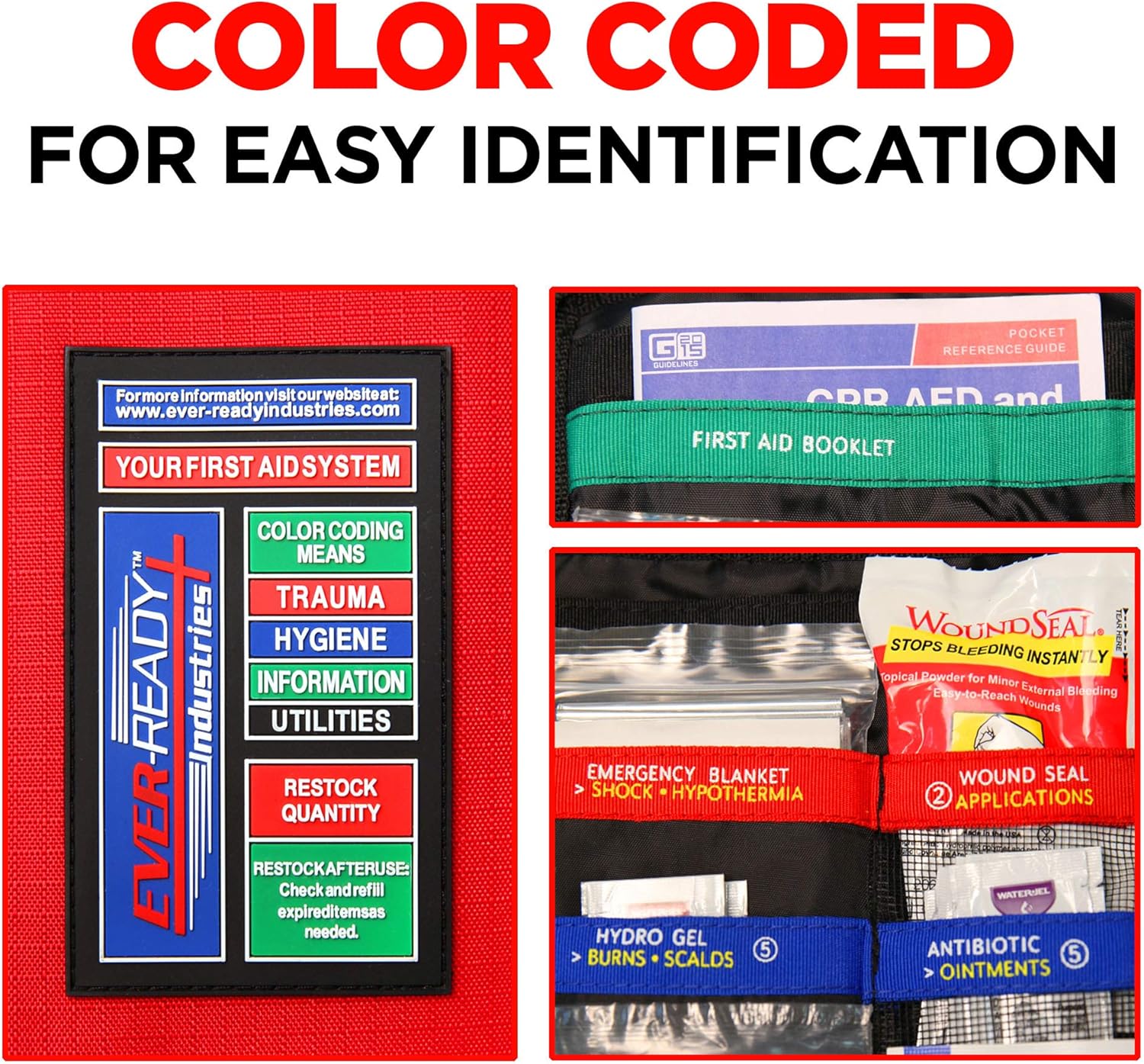 - Color coded and labeled for easy identification and organization, ensuring quick access in emergency situations.