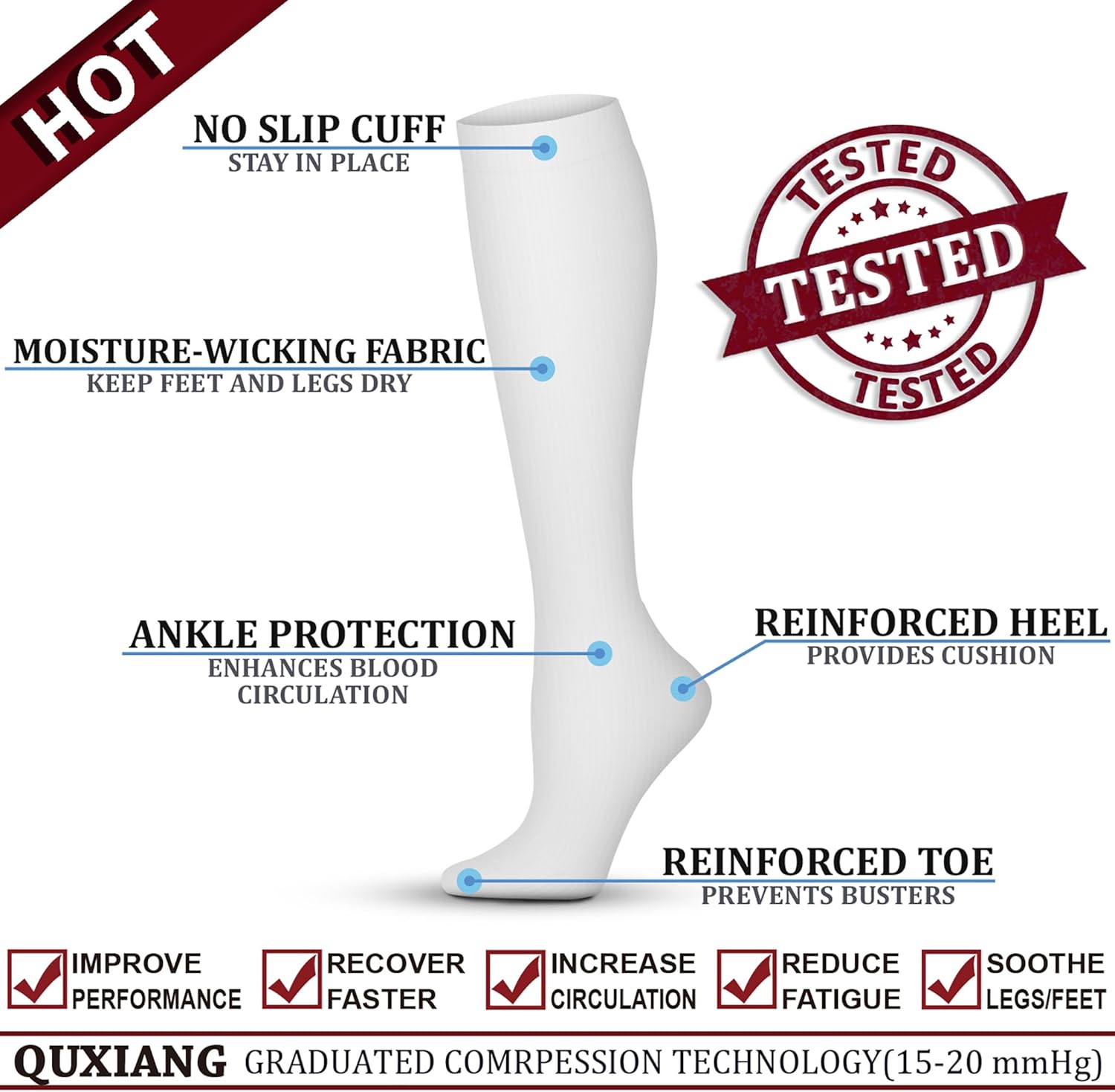 - COMPRESSION BENEFITS - QUXIANG Compression socks are designed to promote blood circulation and oxygen flow preventing fatigue and helps in muscle recovery. Whether you are an athlete, sportsperson, teacher, flight crew, receptionist, office worker, pregnant, recovering patient, nurturing mother, elderly, our socks are universally suitable for all work.