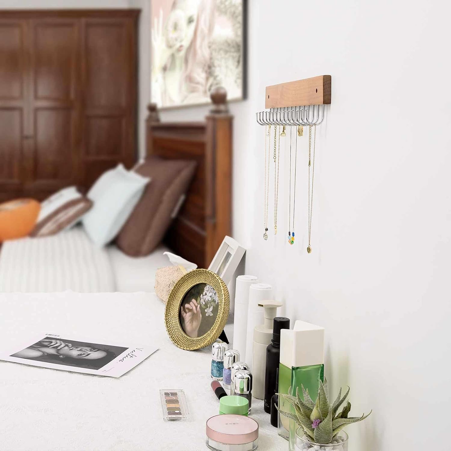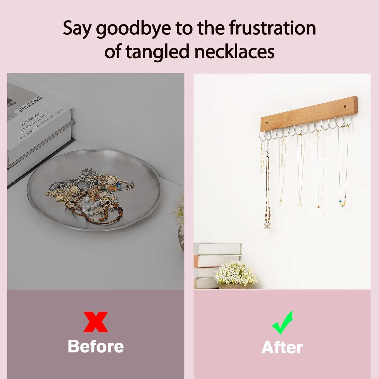 - 【Tangle-Free Necklace Organization】: Say goodbye to the frustration of tangled necklaces. Our wall-mounted jewelry storage hook allows you to hang your necklaces with ease, preventing them from intertwining and making them a breeze to manage. Enjoy the simplicity of a well-organized jewelry display every time.