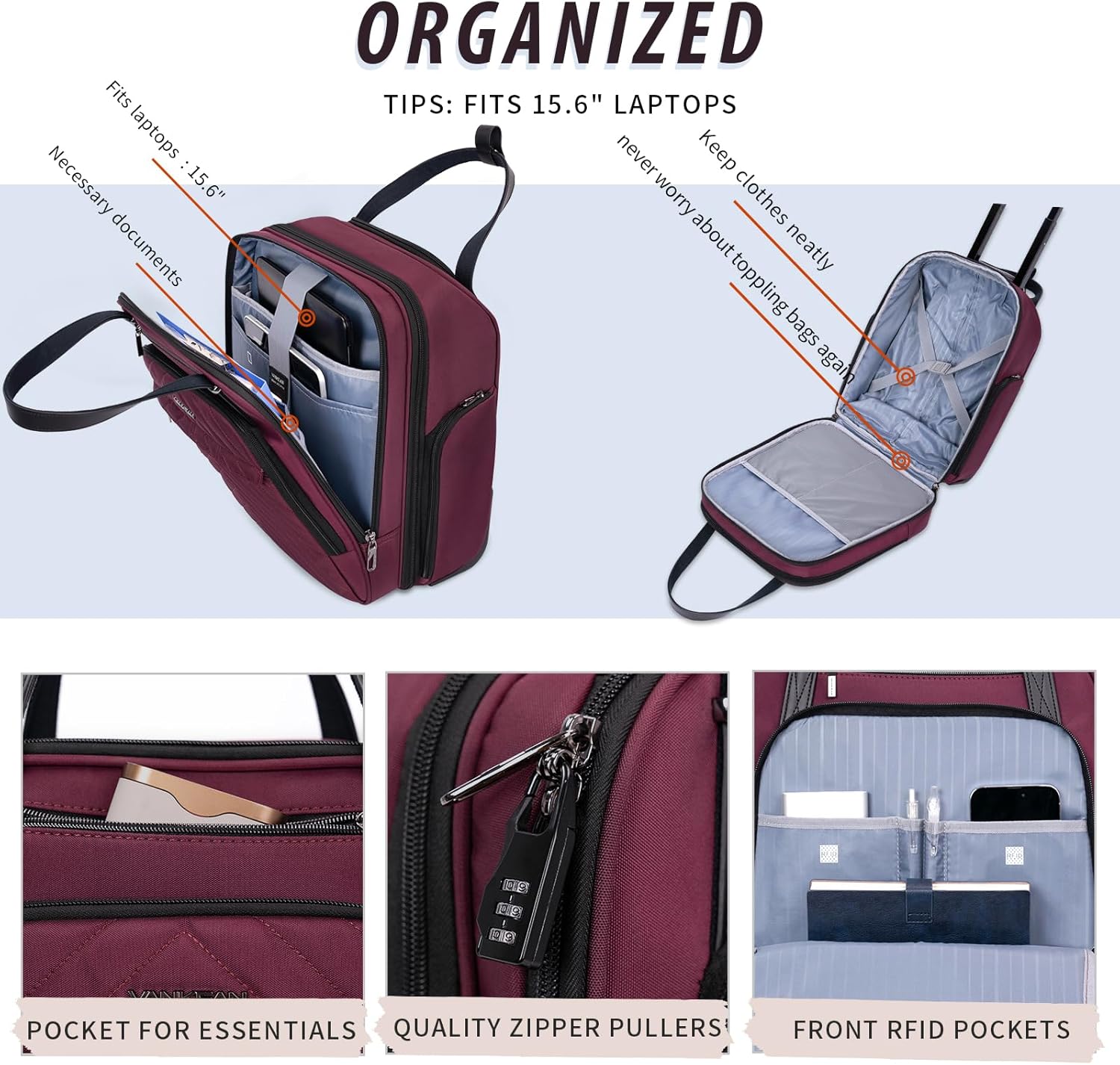 - MULTI-FUNCTIONAL COMPARTMENT: The spacious main compartment can organize your clothes and shoes for your overnight business trip. A padded laptop compartment that fits laptops up to 15.6 inches.Front pockets for easy access to items. Both side pockets for the umbrella and water bottle or other necessary items.