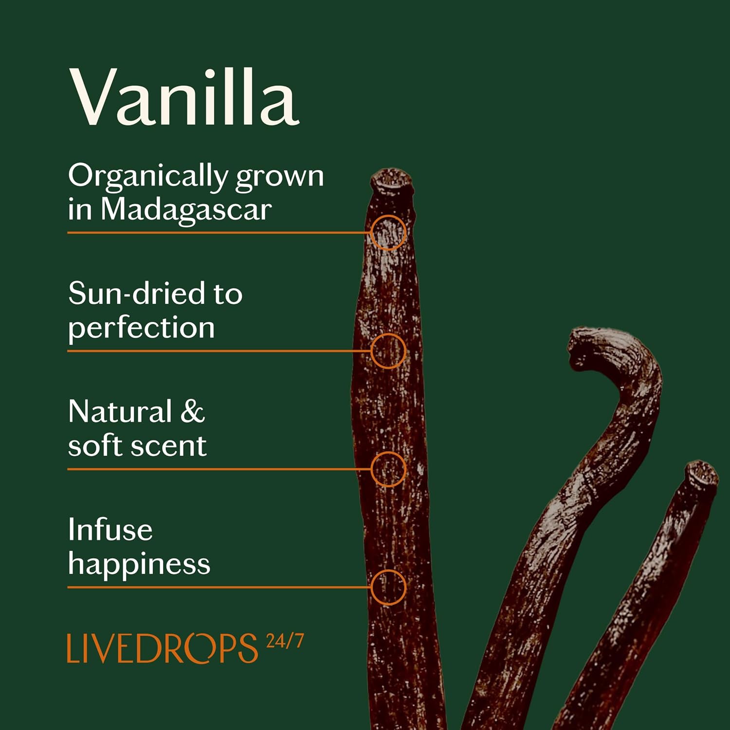 - Create comfort and positivity with Livedrops 24/7 Good Vanilla Essential Oil Blend, crafted in France from Madagascar Vanilla Planifolia and bottled in the USA. Its sweet, warm, and creamy scent is designed to encourage happiness and relaxation.