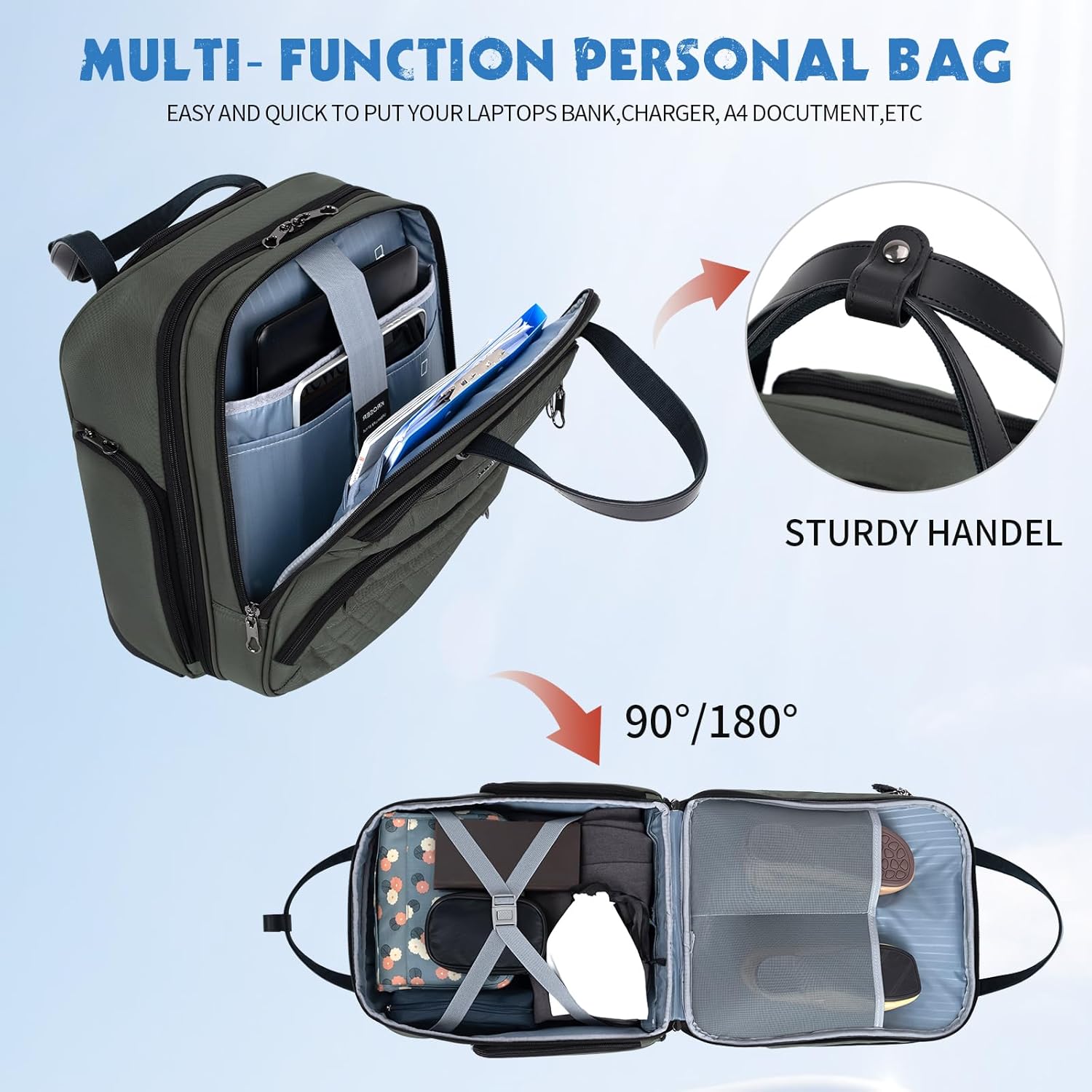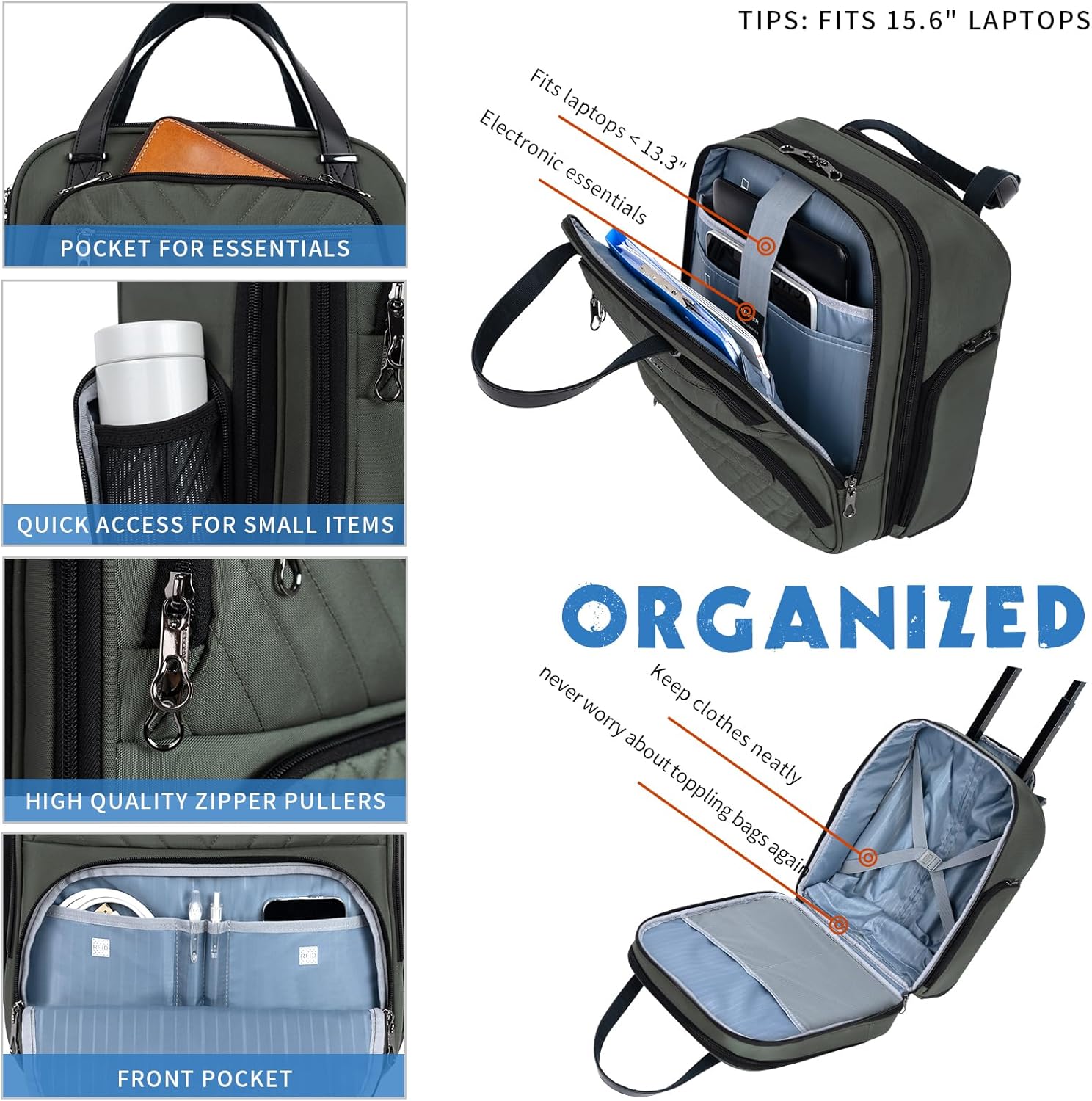 - MULTI- FUNCTION PERSONAL BAG: Spacious main compartment works well for clothes/shoes. Features a padded laptop compartment that fits laptops up to 15.6 inches. Easy-access front organizer for small items. Both sides with zipper pockets for the battery and water bottle.