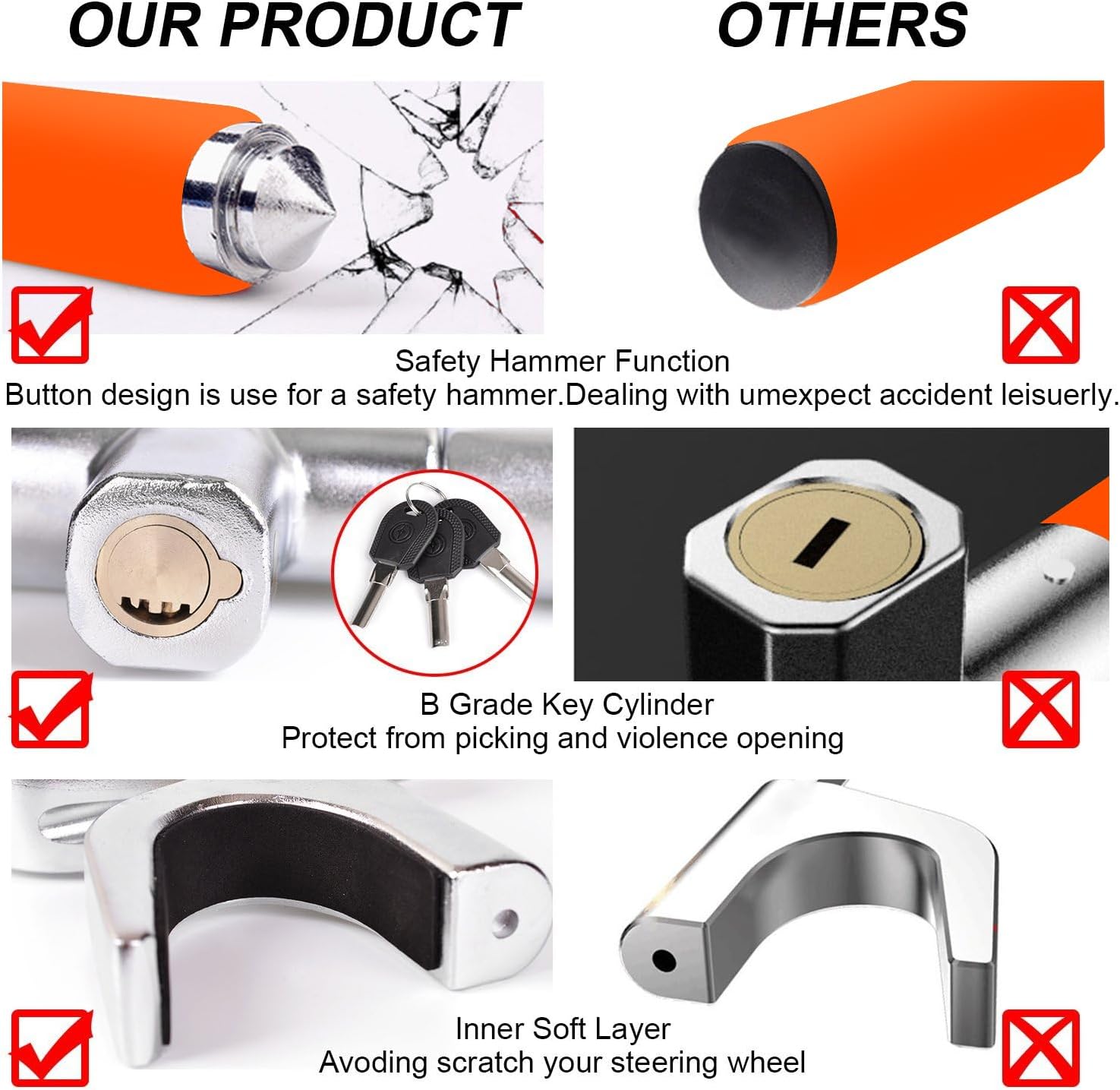 - Tevlaphee Classic Steering Wheel Lock--Better than other competitors! We provide [4 Protective Pads] to you, Others’ NO! Must cause damage or pressure to your steering wheel! We provide [Hammer Cap] to you, Others’ NO! You can’t break the car window or save yourself when emergency happens! We provide [Blue Magic Velcro] to you, Others’ NO! The Lock can’t stored or fixed rightly and scratch to your car! Give Tevlaphee a chance to provide security for you and your car!