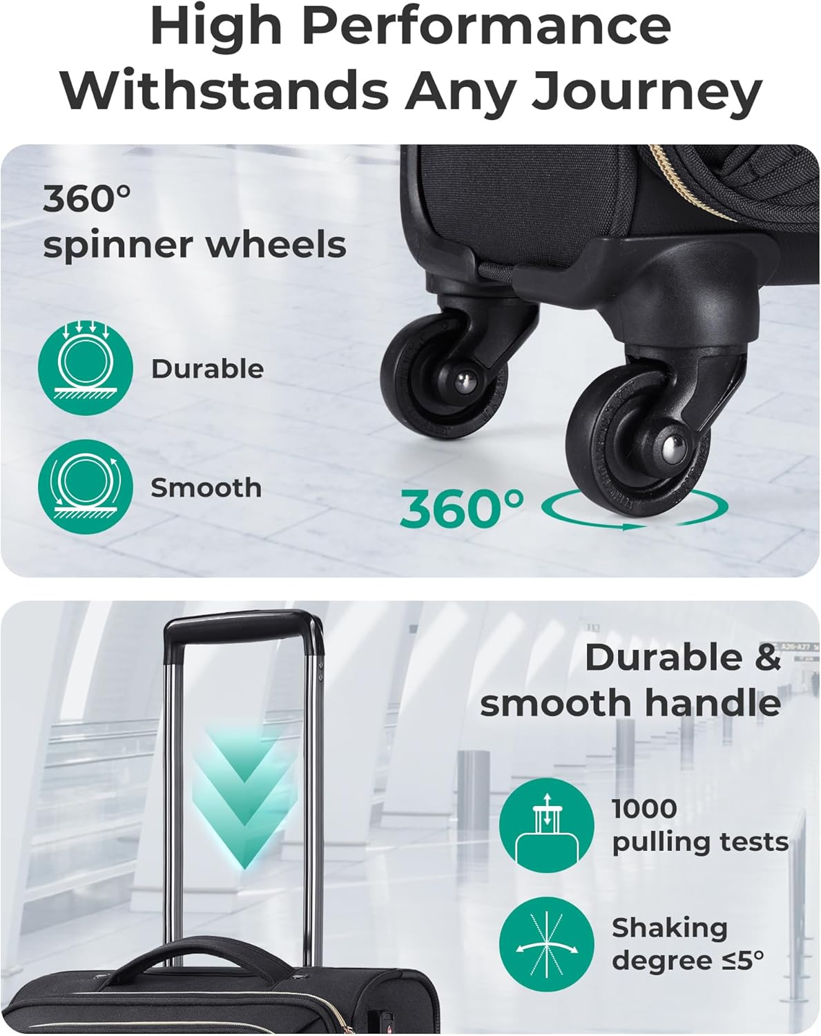- Easy to Maneuver: Featuring 360° spinner wheels, this under seat suitcase guarantees smooth gliding on any surface, even when fully packed, ensuring mobility. The extension handle ensures seamless and long-lasting. 2-step ergonomic high-grade aluminum tube handle can adjust to multiple heights while minimizing wobble, which offers easy mobility. Additionally, sturdy top and side handles offer convenient lifting and carrying options for effortless maneuvering
