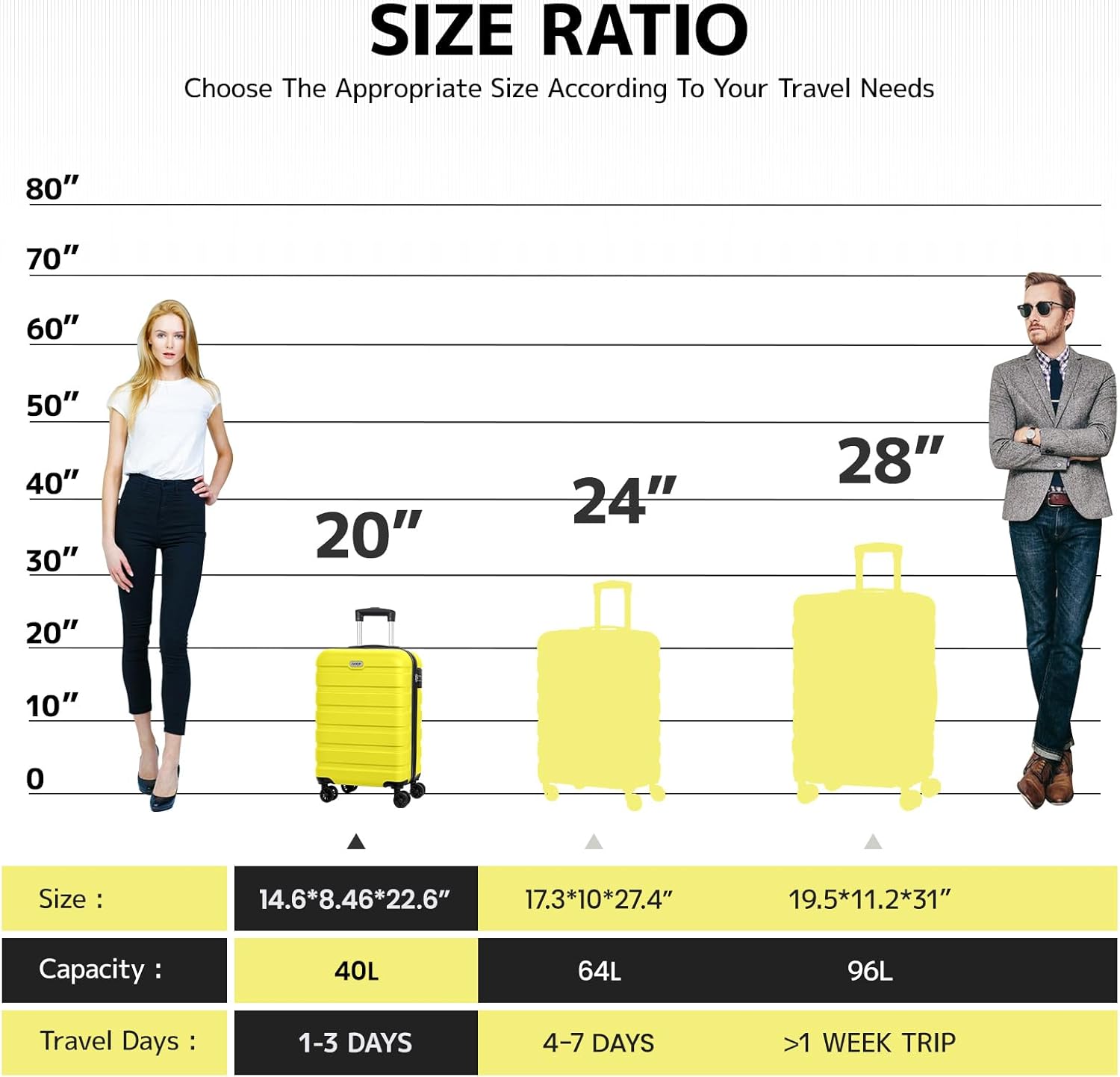 - [Carry-On 20 Inch] The 20-inch suitcase can meet the functions of boarding, travel, and daily storage, and can be brought on the plane without checking in. Size: 14.6*8.46*22.6 inches. Capacity: 40L.