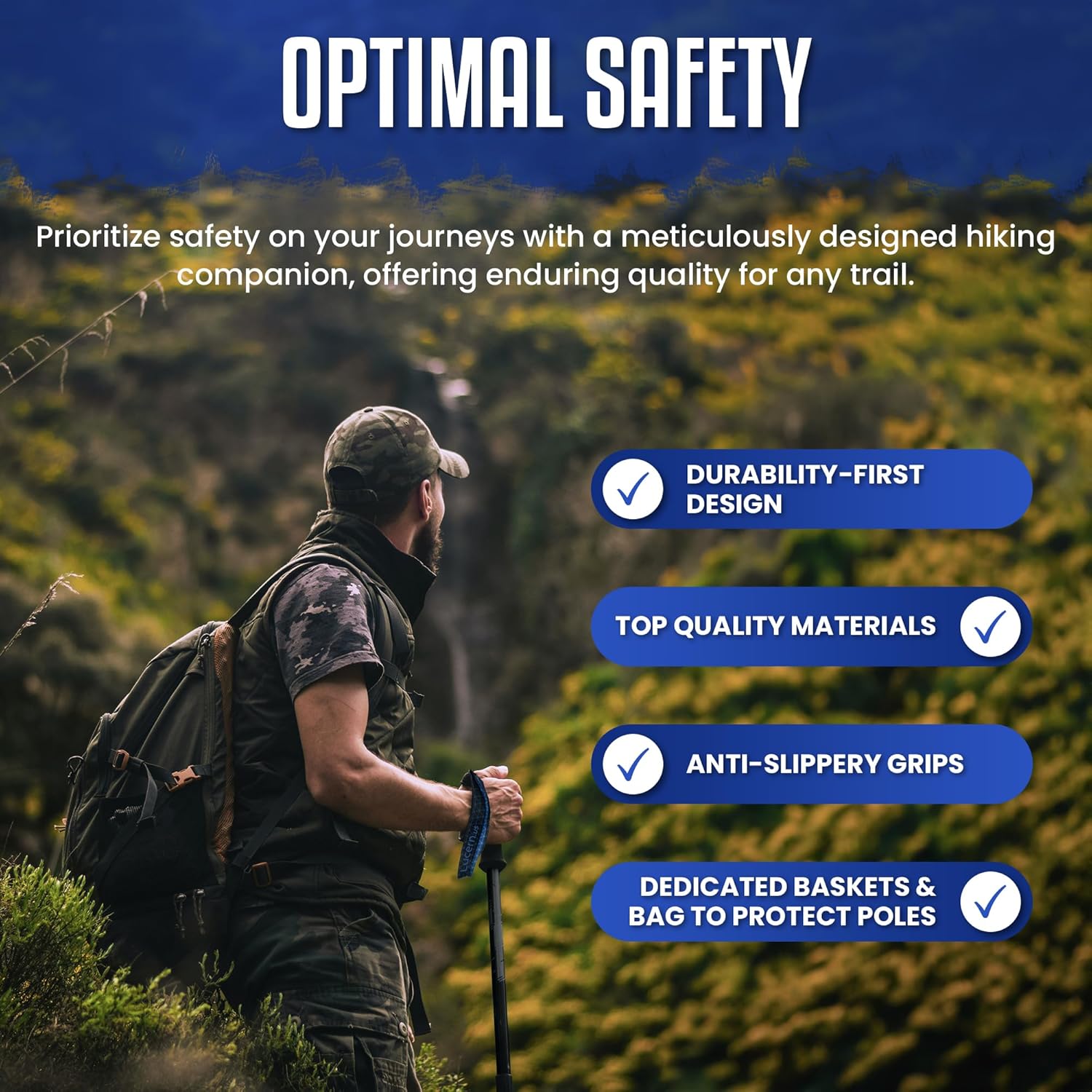- ▶【Optimal safety】The easy and reliable locking mechanism ensures that the poles stay securely extended. Lucern’s hiking pole safety is further enhanced by high-quality durable materials of 100% weaved roll-wrapped carbon fibers and aircraft-grade 7075-T6 aluminum alloy, extra-soft grips to protect sweaty hands from slipping, and dedicated unique protection baskets to protect the poles from damage.