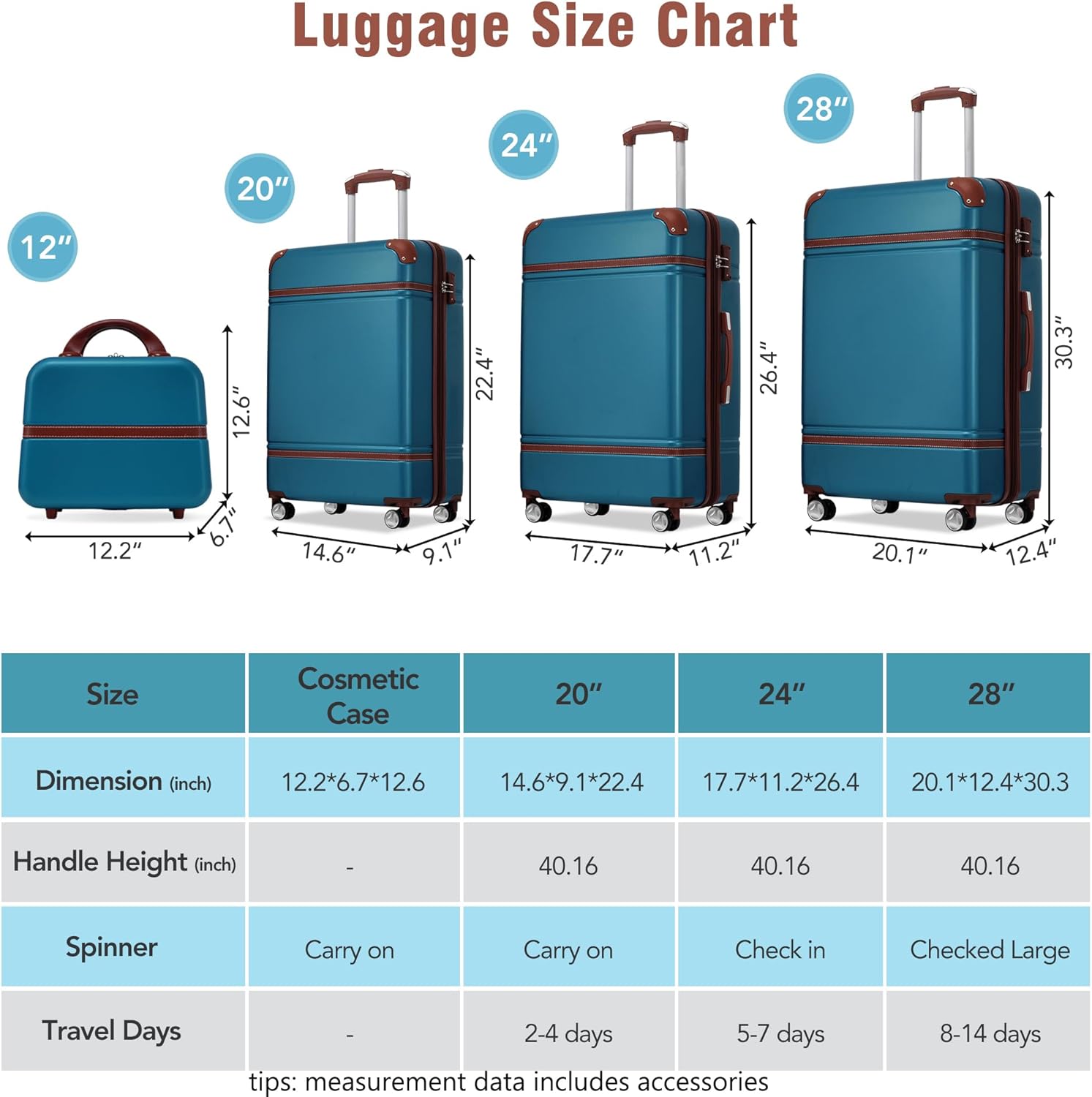 - 4 Piece Suitcase Sets: 1 Cosmetic case and 20 inch,24 inch,28 inch upright luggage set can be stored one into another.20in small luggage is best for carryon (not expandable),only 24in & 28in can expand 25% for more spaces.