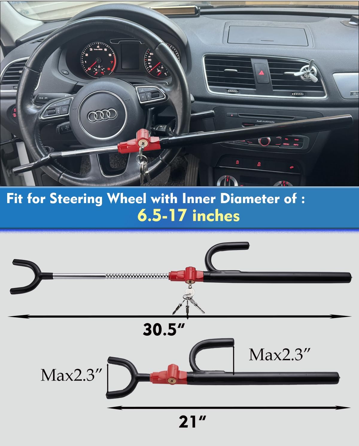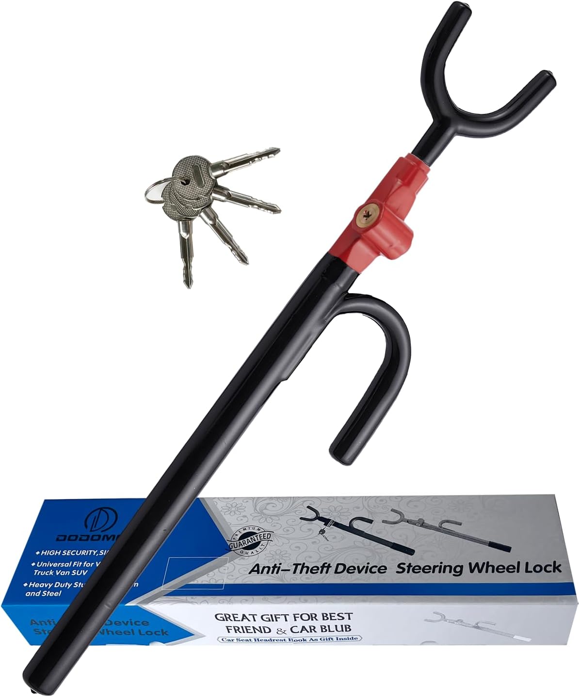 - UNIVERSAL FIT : The car steering wheel lock fit for most vehicles, including cars,trucks, vans, golf cart and SUVs. The twin hook design allows the lock to hook more tightly onto the steering wheel.