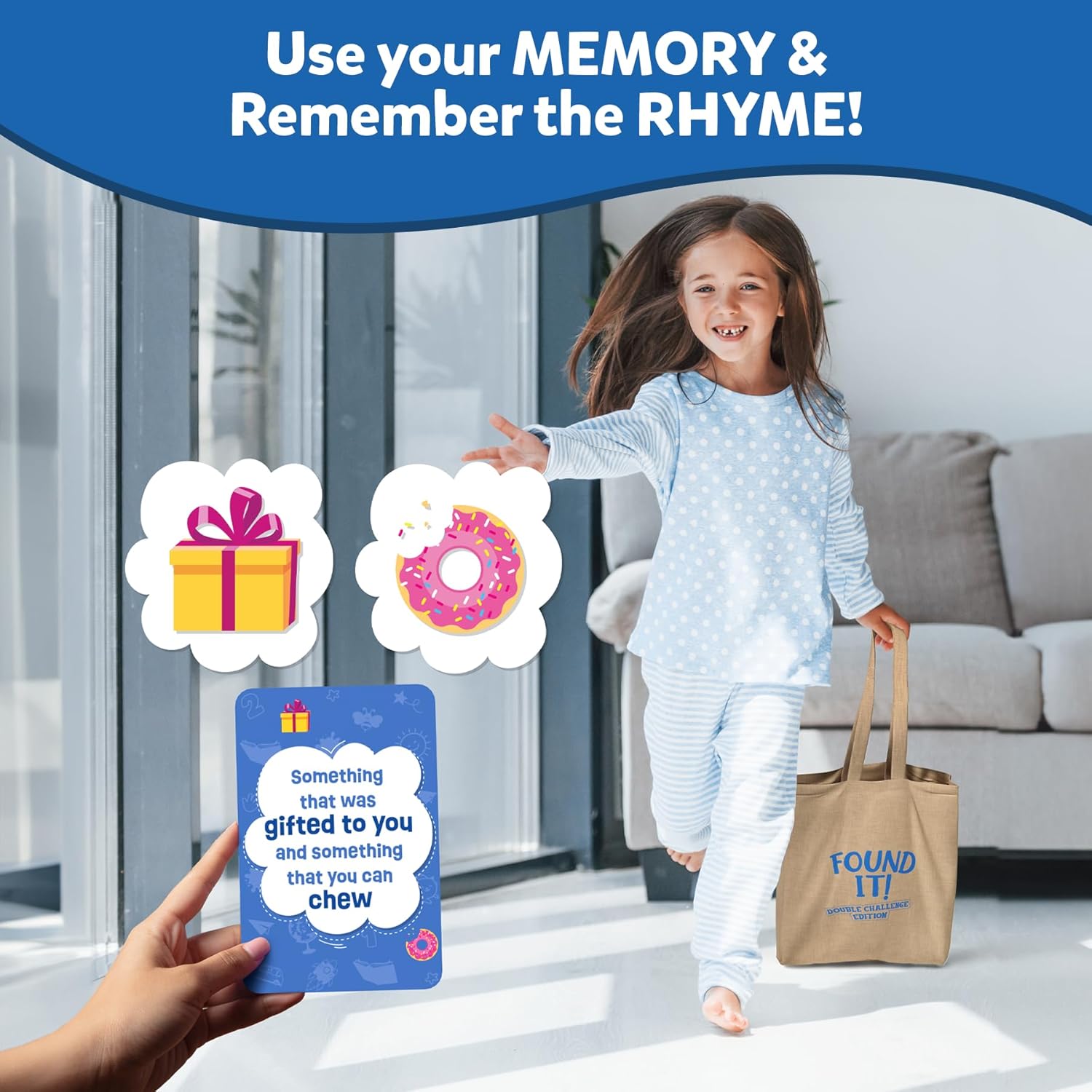 - DOUBLE CHALLENGE SCAVENGER HUNT: Embark on a quick-thinking 'Search & Find' adventure with rhyming prompts like "Can you find something purple and something that looks like a circle?" or "Something black and something you enjoy eating as a snack?" Challenge your child's memory as they repeat the prompts and hunt for two objects- one for each one!