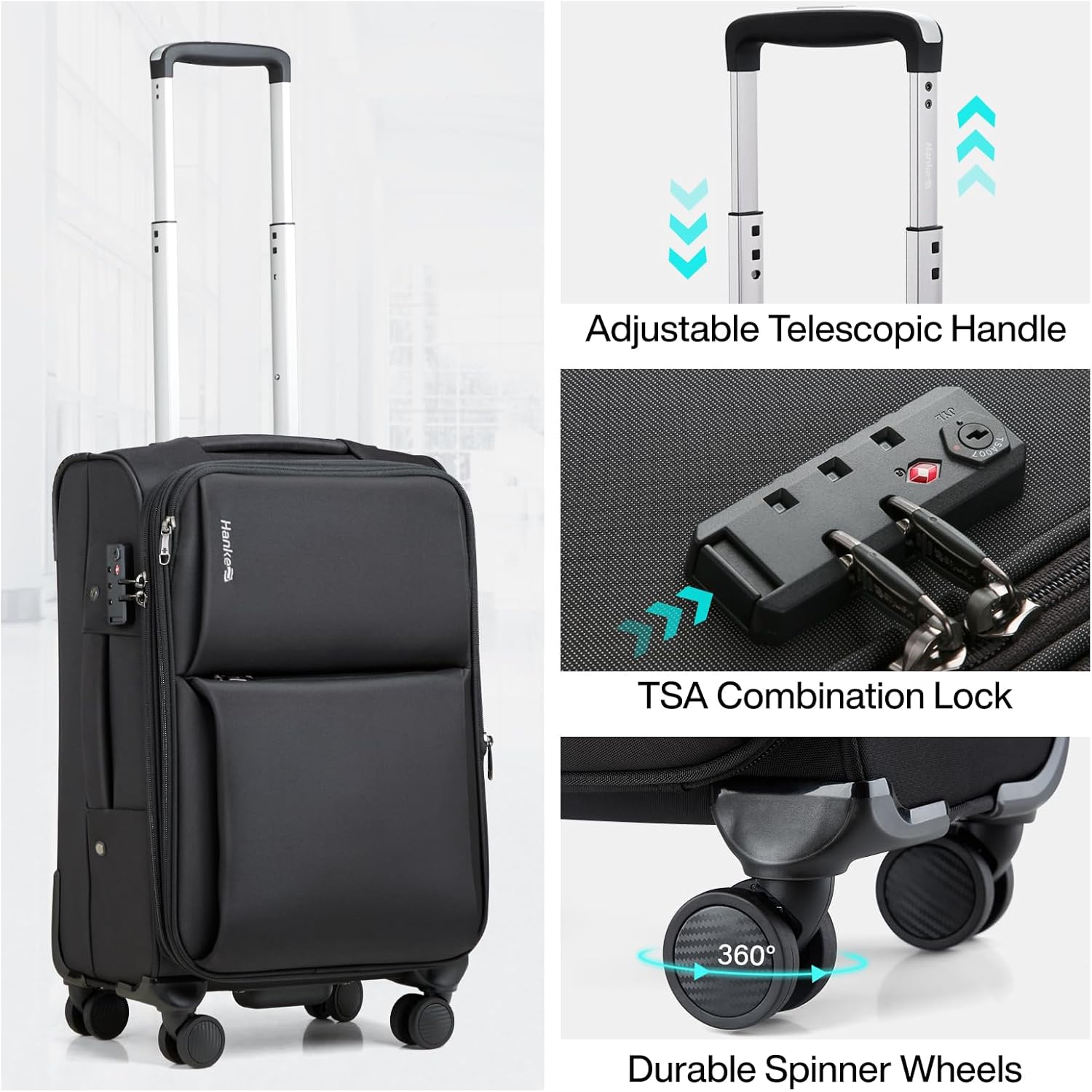 Hanke 3 Piece Luggage Sets Softside Expandable Carry On Luggage Set Travel Suitcase Sets with Spinner Wheels TSA Approved Luggage(Black, 20in/24in/28in)