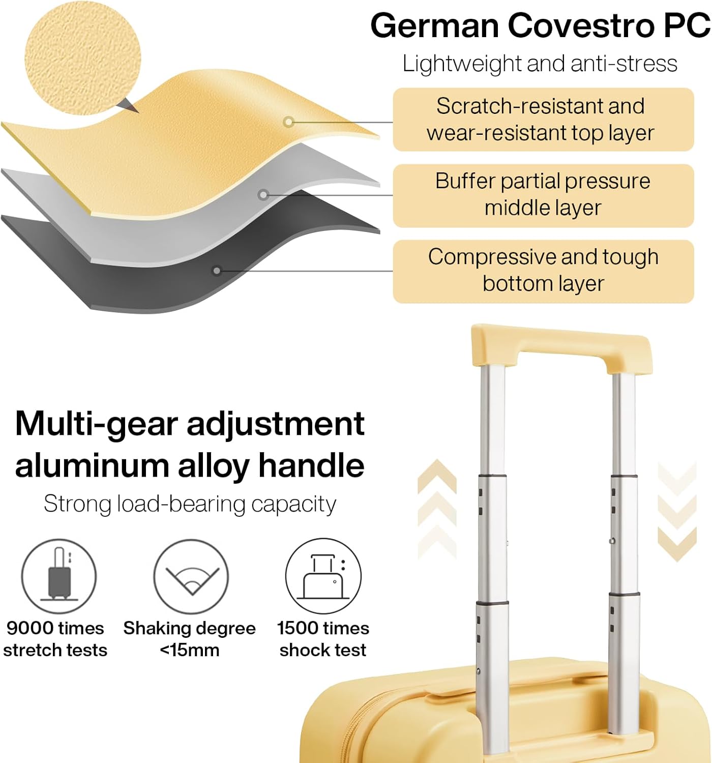 - Ergonomic adjustable aluminum alloy telescoping handle with push button locking system is easy maneuvering when extended. And design with Soft Rubber top carry handle and side carry handle not only make you more convenient to carry check in luggage, but also provide comfort after a long journey. This trolley case handles were still smooth and stable After 1500 shock tests, 9000 fatigue tests.
