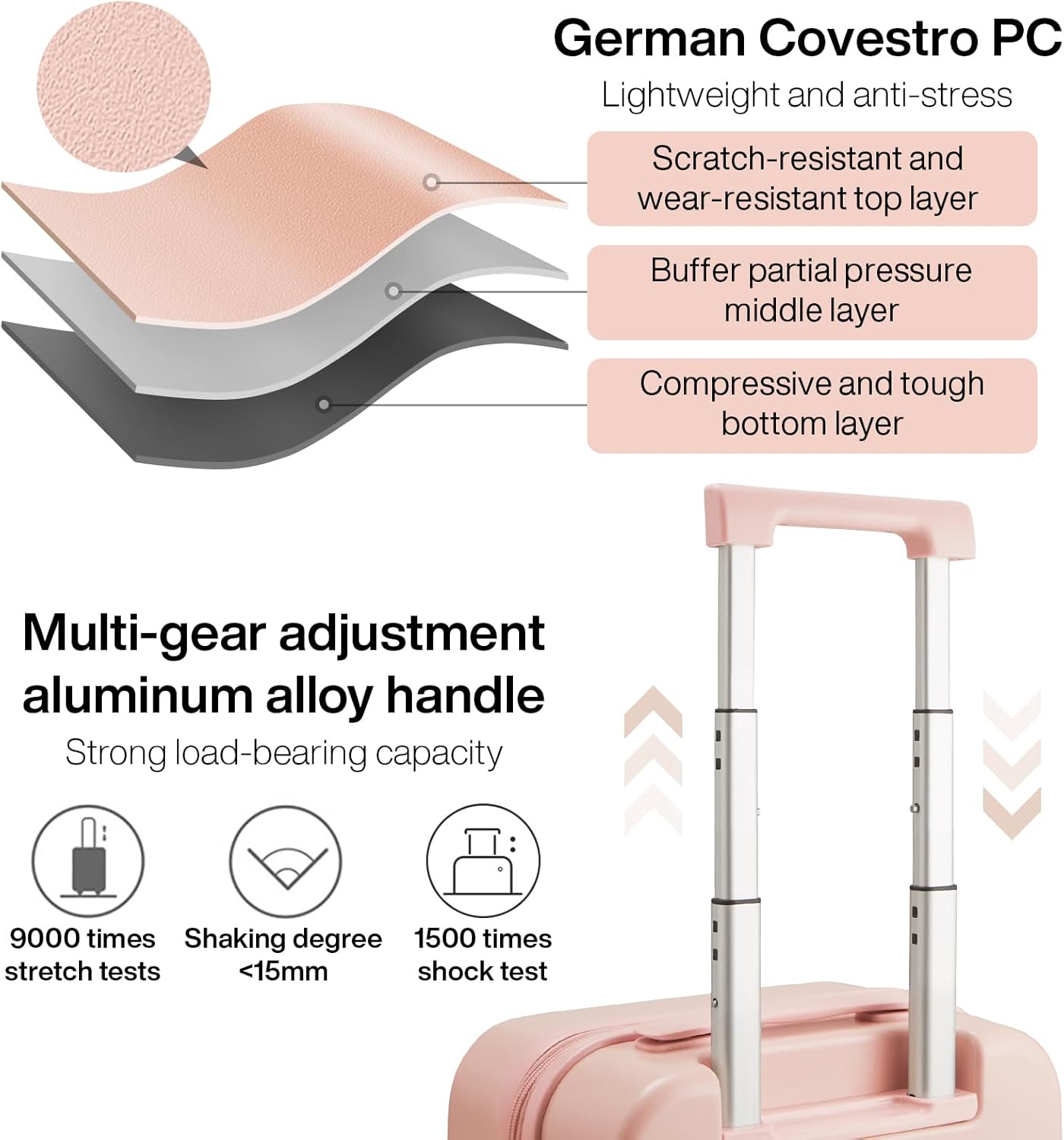 - Ergonomic adjustable aluminum alloy telescoping handle with push button locking system is easy maneuvering when extended. And design with Soft Rubber top carry handle and side carry handle not only make you more convenient to carry check in luggage, but also provide comfort after a long journey. This trolley case handles were still smooth and stable After 1500 shock tests, 9000 fatigue tests.
