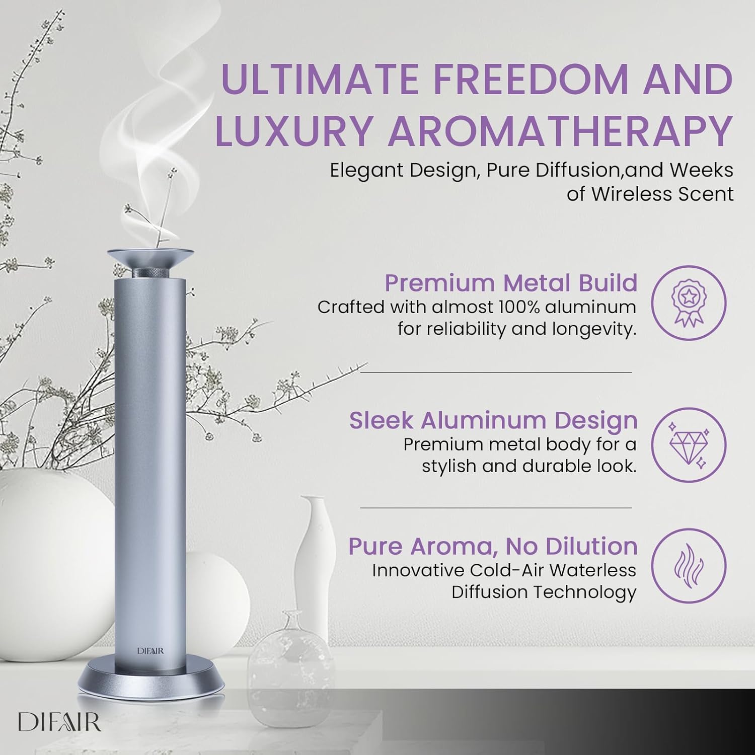 - [Premium Build Quality]: Crafted from high-quality aluminum, our waterless oil diffuser is built to last. Despite other products our air diffusers for home are bult from almost 100% metal body and bottle accompanied with high sensitive touch control ensuring a sleek look and reliable pure performance, making our home luxury scents diffuser for waterless diffuser oil a superior choice for those who value both aesthetics and functionality.