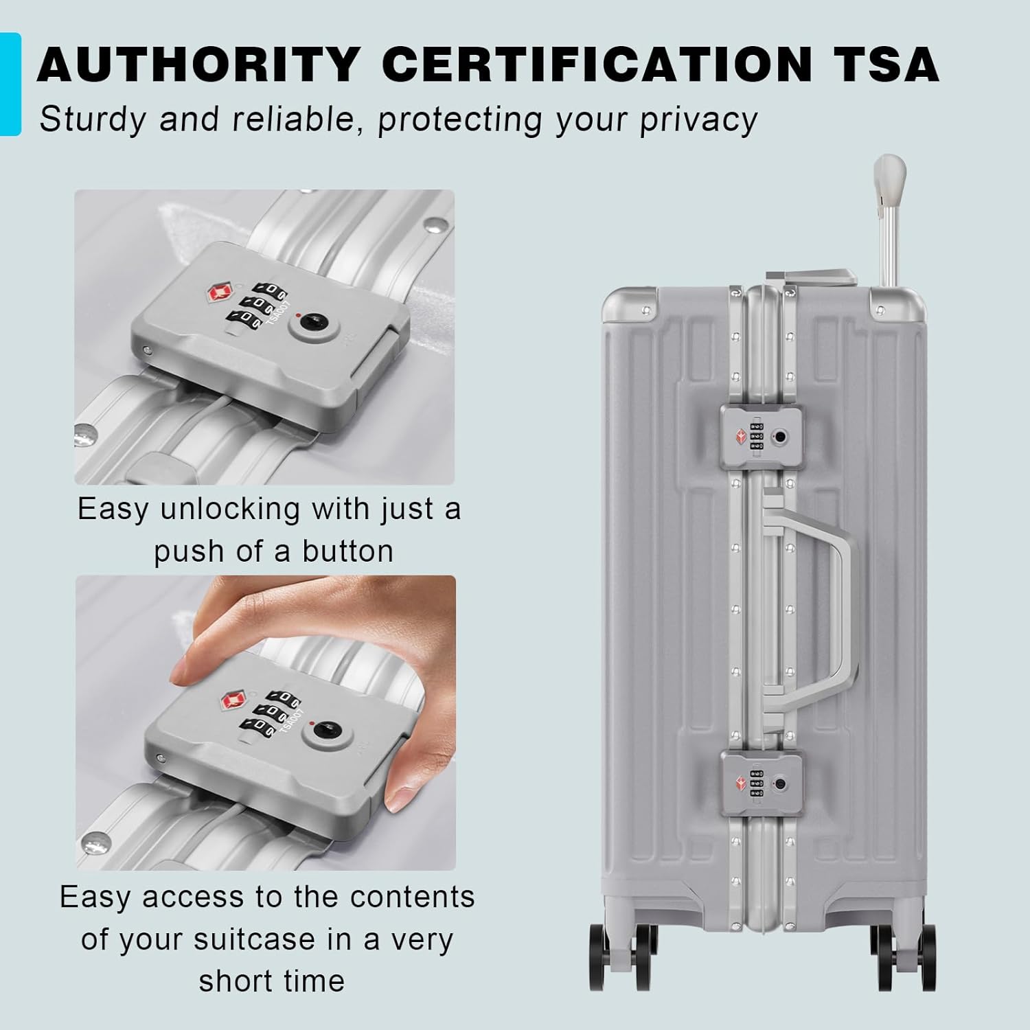 - TSA Lock: The TSA lock is designed to be easily unlocked with just one push, providing convenience for your travelling. What's more, the double-layer TSA Customs zip is sturdy and reliable, greatly improving safety and security.